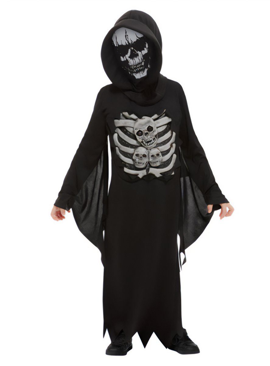 Verwandle dein Kind in einen kleinen Tod! Das Seelensammler-Kostüm besteht aus einer schwarzen Robe mit Knochen- und Schädel-Applikationen und einer Maske. Perfekt für Halloween und alle kleinen Gruselfans.