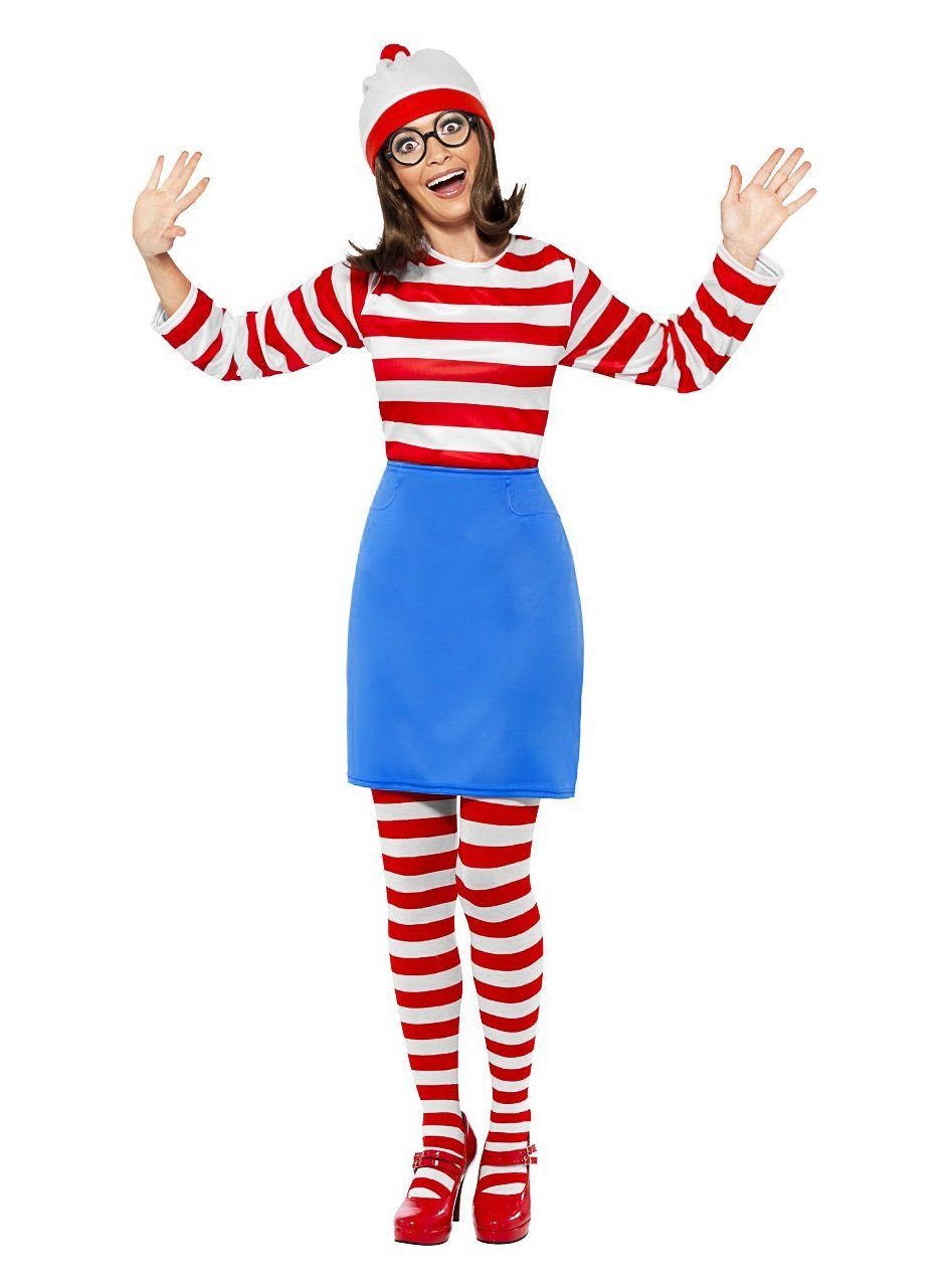 Wenda ist die Freundin von Walter aus der Comicbuchreihe 'Wo ist Walter?'. 5-teiliges Wenda Kostüm mit Rock, Oberteil, Strumpfhose, Pudelmütze, Brille.