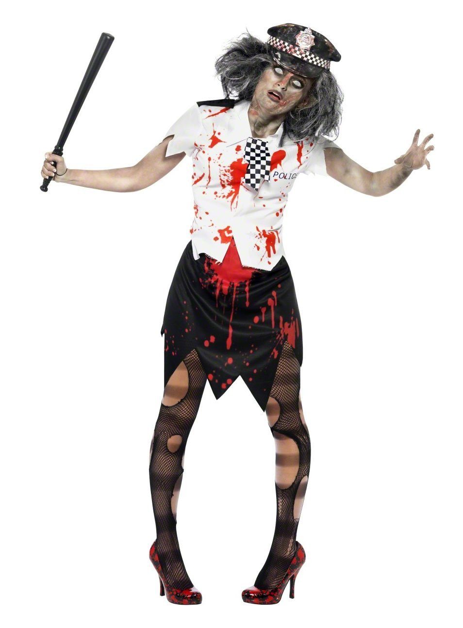 Das kurzärmelige Uniform-Hemd war einmal strahlend Weiß, jetzt prangen große, rote Blutflecken auf dem tailliert geschnitten Oberteil, das frontal mit Klettverschluss angelegt wird. Vom aggressiven Untoten Alltag zeugen auch die zerfetzten Säume am Hemd sowie dem schwarzen Minirock. Der sitzt dank eines Gummizugs eng an der Taille und fällt von dort in einen grob gezackten, kurzen Saum. Auch auf dem schwarzen Material setzt sich das kräftige Rot der Blutspritzer in schönem Kontrast effektvoll ab. Selbst wenn die Zombie Politesse heute lieber Menschenhirne verspeist als Strafzettel zu verteilen, so verweisen doch die separate, schwarze Polizei-Schirmmütze mit silbernem Polizeiabzeichen, sowie die schwarzen Schulterstücke am Uniformhemd sowie die fixierte Krawatte und der Polizeiaufdruck vorne links noch auf ihre frühere Berufung.