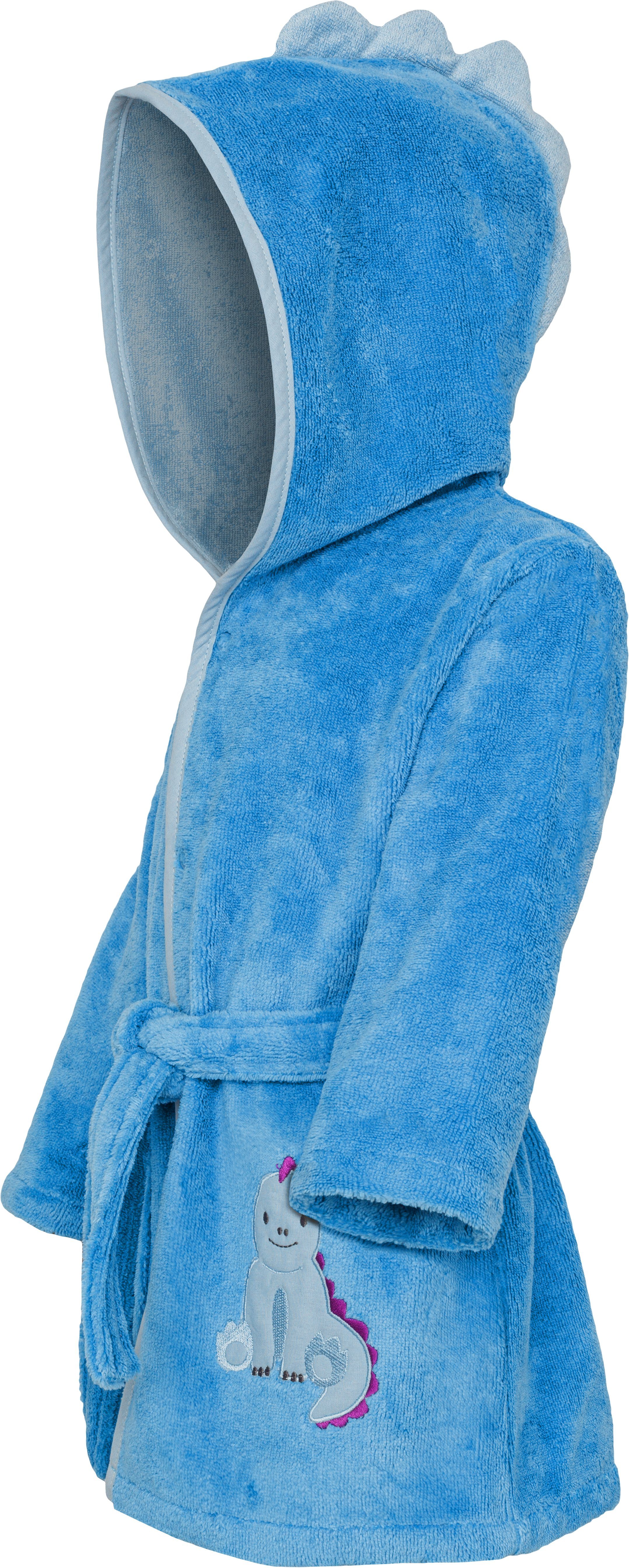 Die Außenseite des Bademantels ist in einem kräftigen Blau gehalten und besteht aus strapazierfähigen Microfasern. Diese sorgen dafür, dass der Mantel allen Abenteuern standhält und auch nach wildem Spielen keine Abnutzungserscheinungen zeigt. Auf der Innenseite erwartet die kleinen Dino-Liebhaber eine Naturfaser, die ganz natürlich, flauschig und bestens für sanfte Kinderhaut geeignet ist.