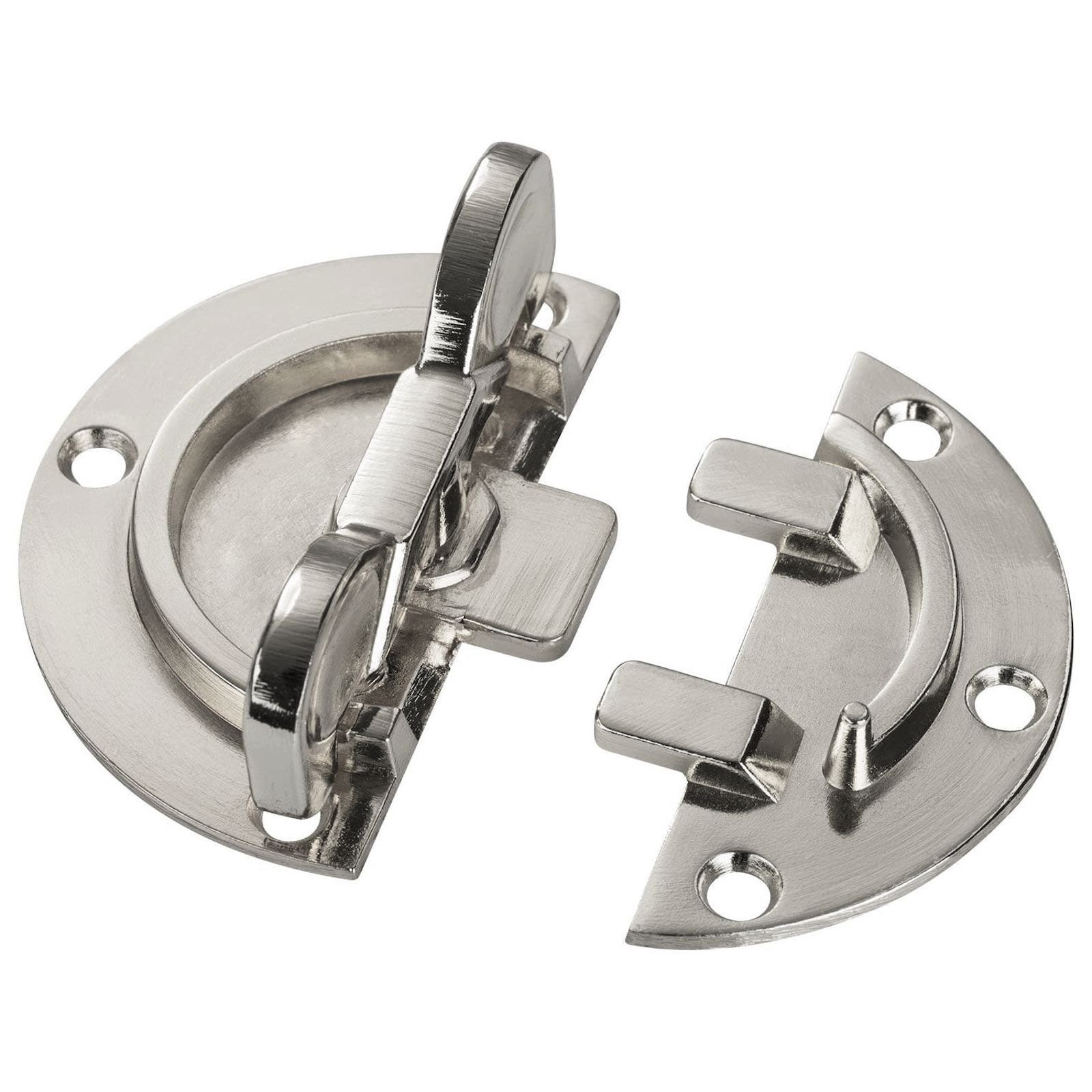 Für die Verbindung von aneinander geschobenen Tischplatten. Durch eine rechtsdrehung des Drehriegels werden die Tischplatten fest miteinander verbunden. Wird die Verbindung der Tischplatten nicht mehr benötigt, kann diese einfach mit einer linksdrehung des Riegels gelöst werden.