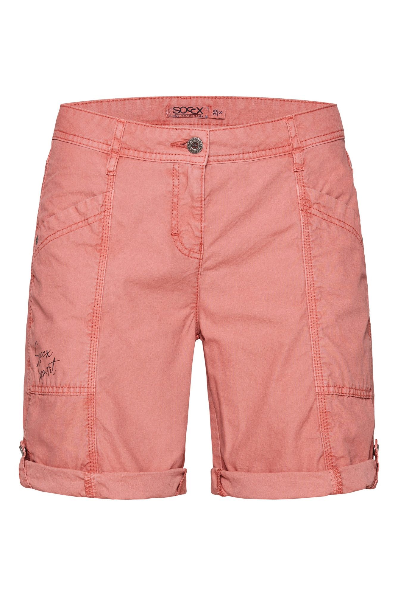 Die SOCCX Bermuda mit Turn-Up in Beachy Red ist Teil der SOCCX Damen Sommermode und eignet sich perfekt für einen lässigen Casual Look. Ob kombiniert mit einem lockeren Shirt oder einer schicken Bluse - mit dieser Bermuda sind Sie immer modisch unterwegs.