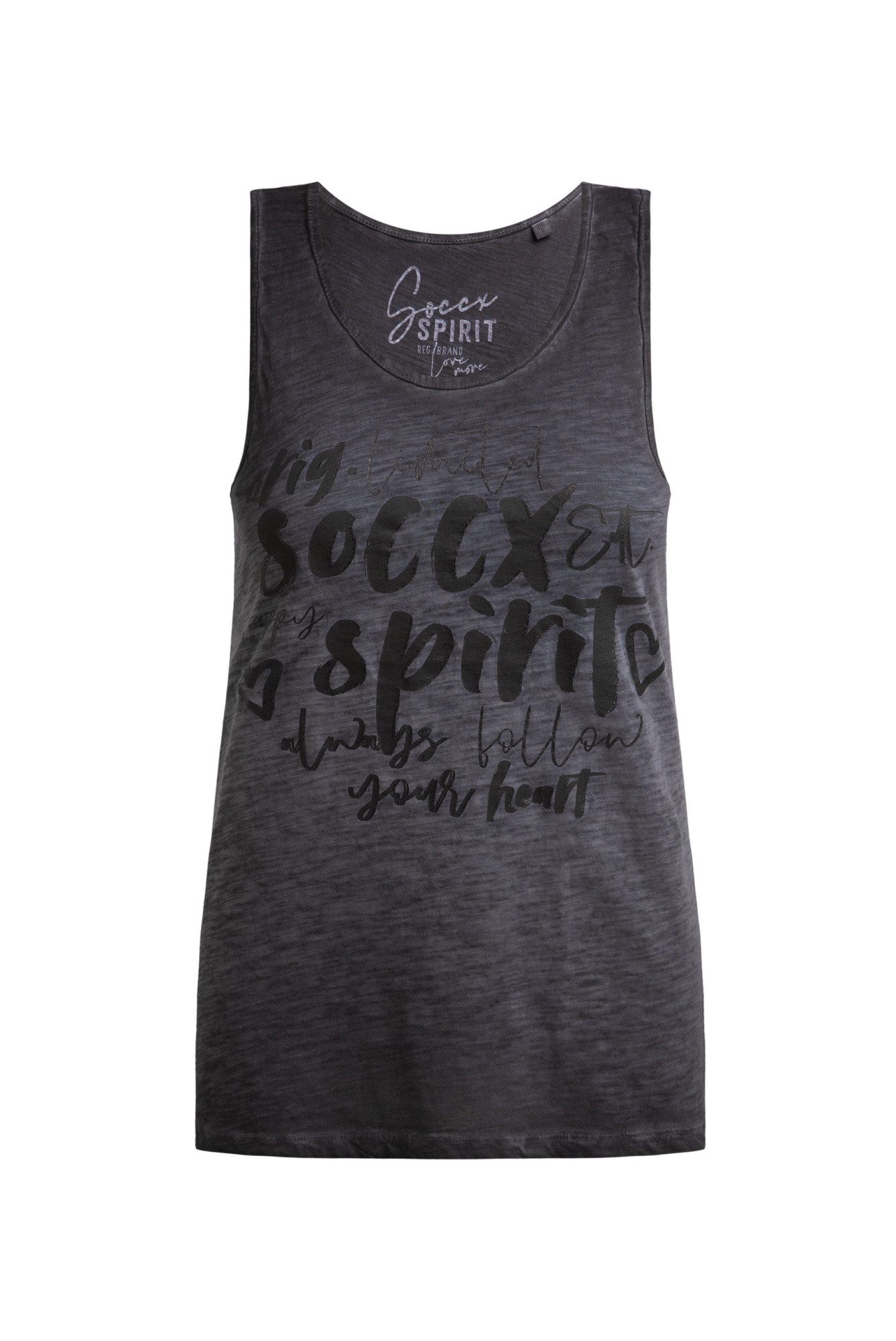 Das SOCCX Damen Top in Grau ist ohne Ärmel und verfügt über einen klassischen Rundhalsausschnitt. Der auffällige Print in Form von Wording verleiht dem Top das gewisse Etwas und macht es zu einem echten Hingucker. Ob in Ihrer Freizeit oder bei einem entspannten Stadtbummel - mit diesem Top liegen Sie immer richtig!