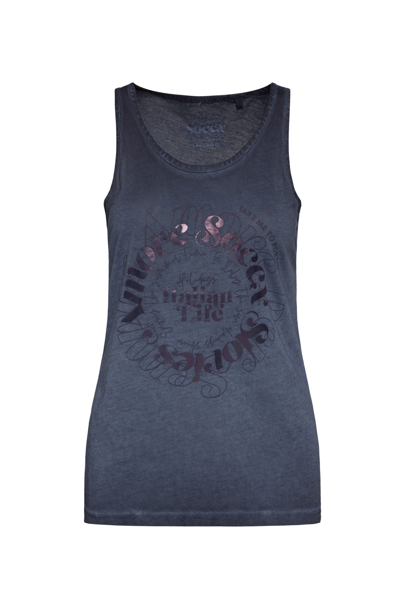 Entdecken Sie das SOCCX Top Oil Dyed in Deep Sea für Damen - ein Must-Have für Ihren Kleiderschrank! Das Top in Blau besticht durch seinen Rundhalsausschnitt, das trendige Muster Wording und den ärmellosen Schnitt. Perfekt für lässige Freizeitlooks!