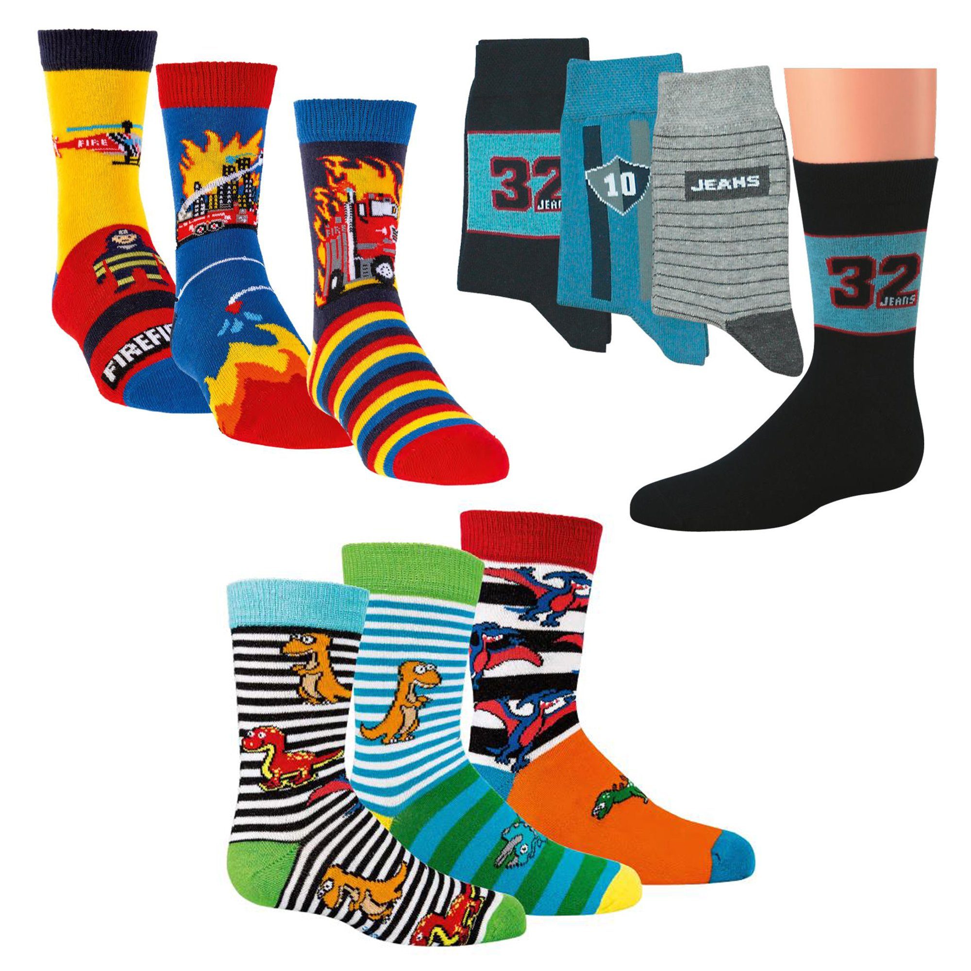 Kindersocken mit bunten Motiven (siehe Fotos). Hoher Anteil hautsympathischer Baumwolle und besonders haltbar durch Beimischung von Polyamid. Handgekettelte weiche Naht.