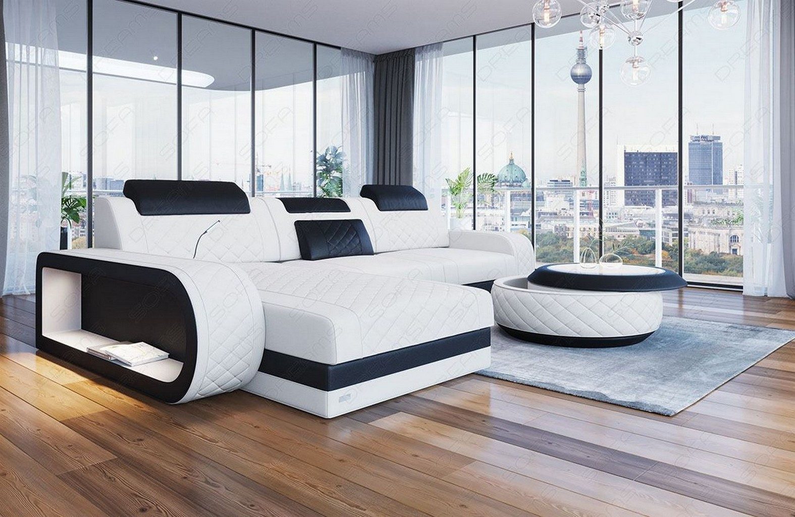 Das Leder Ecksofa Berlin L Form überzeugt mit eleganter Optik, hochwertigen Materialien und praktischen Extras. Wählen Sie Ihre bevorzugte Lederart und genießen Sie Luxus & Komfort in Ihrem Zuhause!