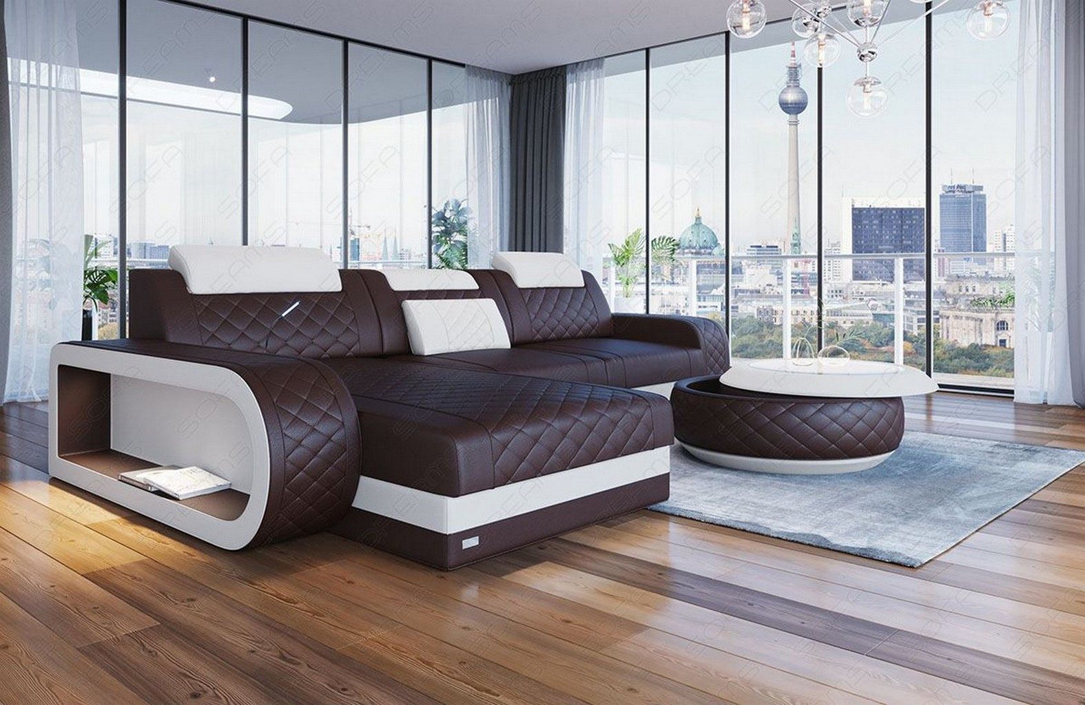 Das Leder Ecksofa Berlin L Form verbindet stilvolles Design mit modernen Features und höchstem Sitzkomfort. Die elegante Form mit Ottomane bietet viel Platz zum Entspannen und passt perfekt in jedes Wohnambiente.