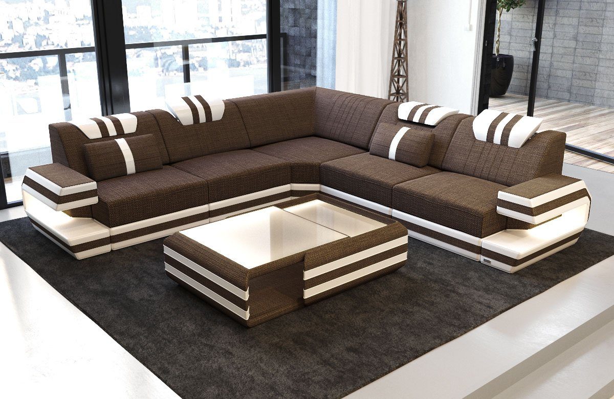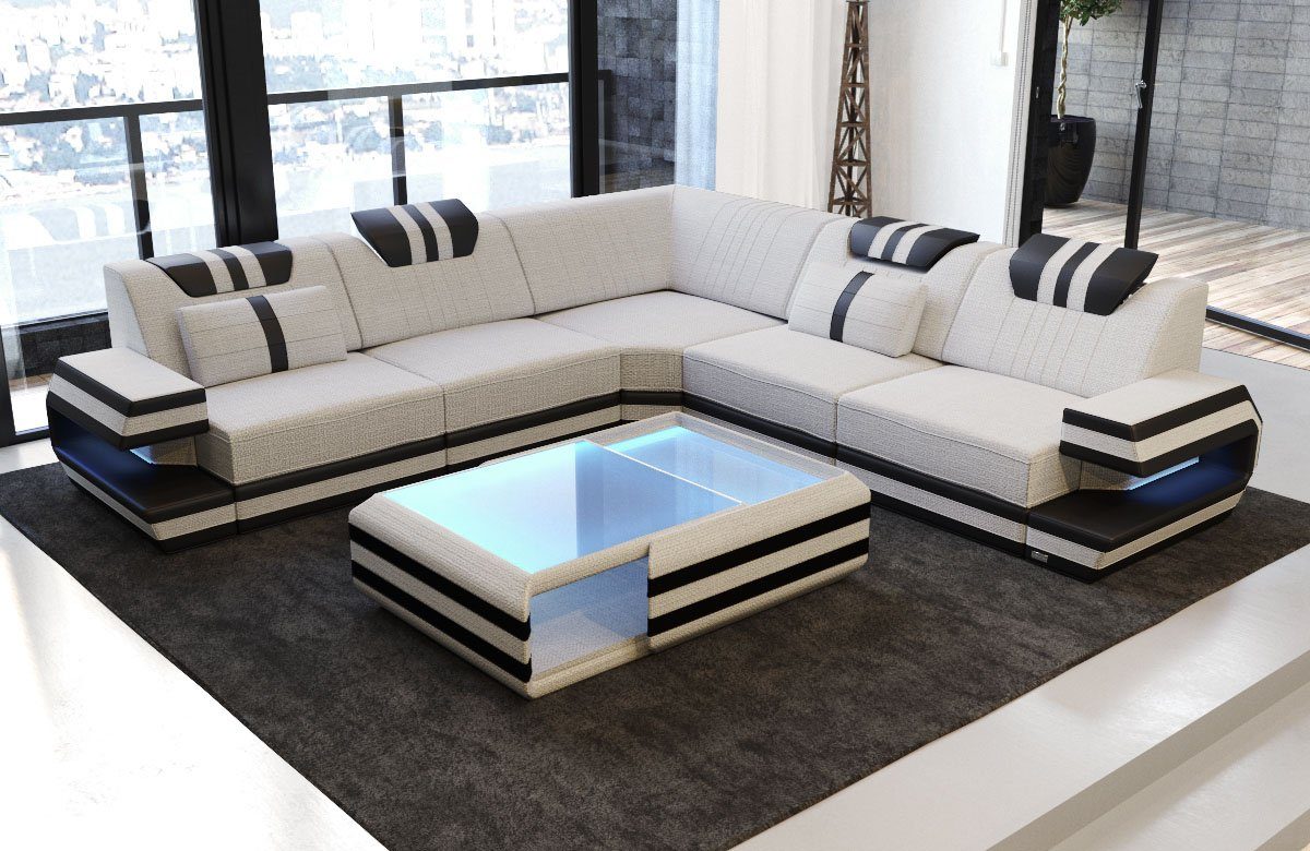 Die Strukturstoff Eckcouch Ragusa L Form ist in jeder Hinsicht auf der Höhe der Zeit. Während die extravagant geformte Armlehne und das flotte Streifendesign die Blicke auf sich ziehen, hat das Stoffsofa zusätzlich manches Extra zu bieten. Dazu gehört die LED-Beleuchtung mit Farbwechsel an beiden Seiten. Im Gestell integrierter Stauraum und vornehme Hochglanzablageflächen bieten Platz für Gegenstände, die Sie gerne griffbereit haben. Wählen Sie auch praktische optionale Extras wie einen Hocker in den Farben des Sofas. Die Stoff Couch Ragusa verfügt über einen USB-Anschluss.