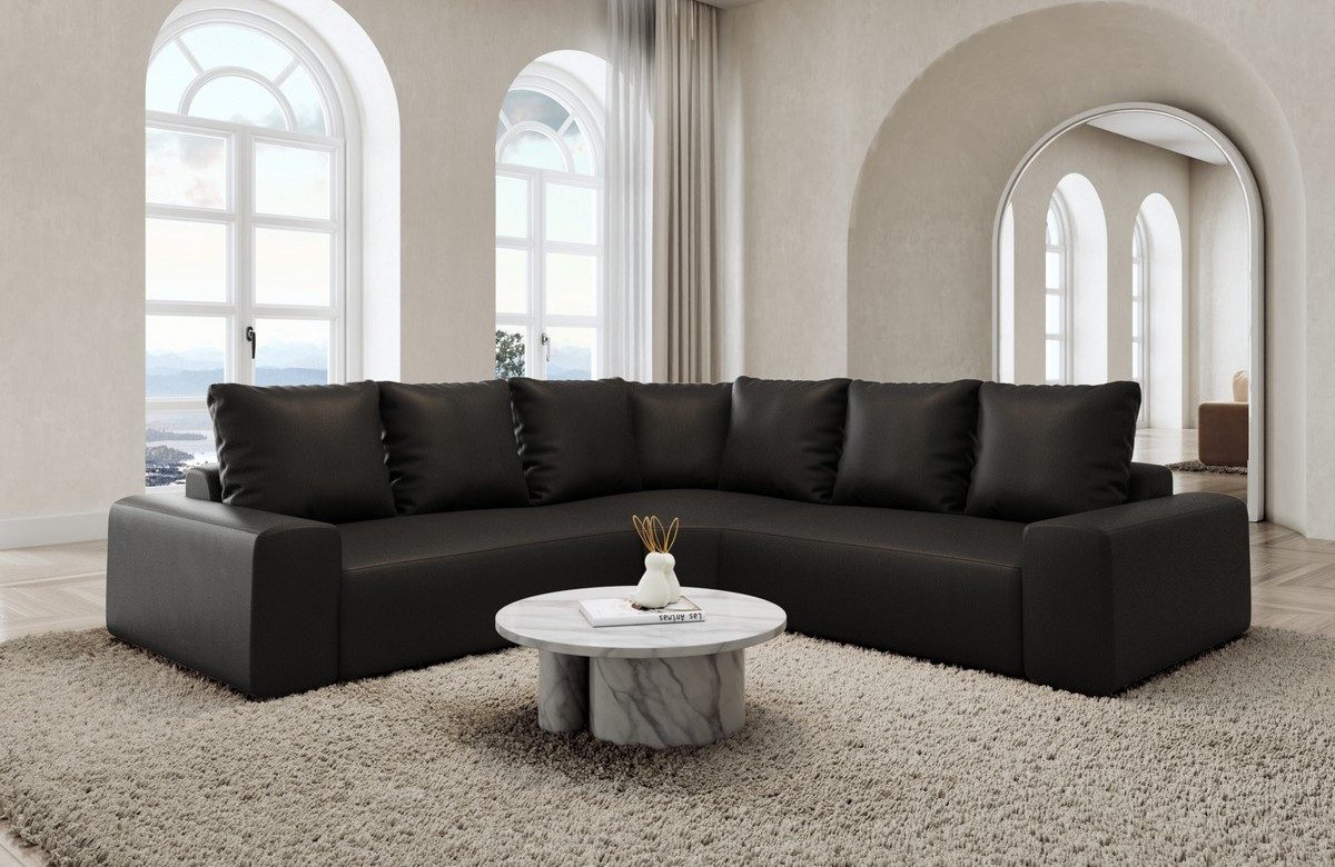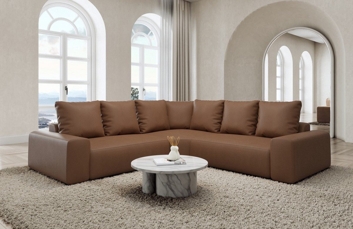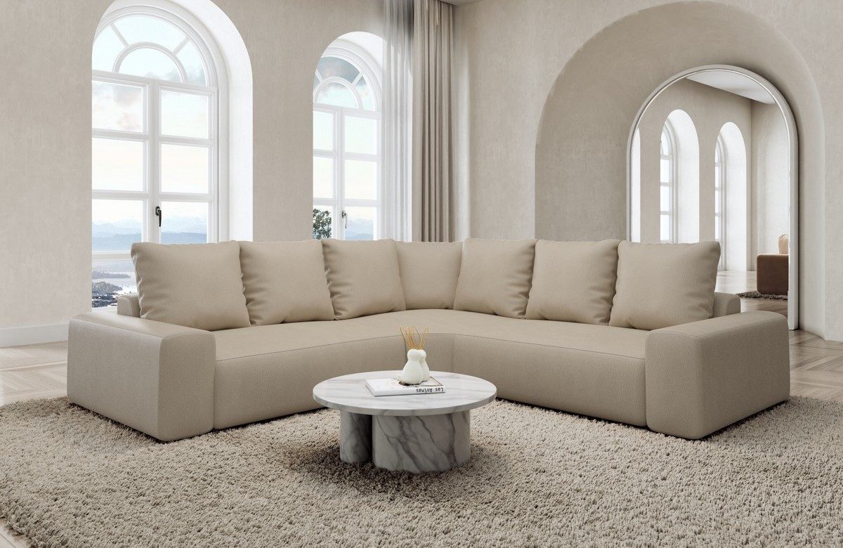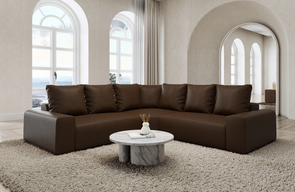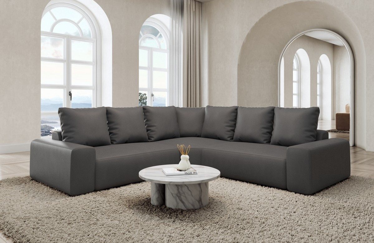 Die elegante L-Form des Sofas passt sich harmonisch an jede Raumgestaltung an. Die großzügige Sitzfläche bietet ausreichend Platz für gesellige Abende oder entspannte Momente. Die stilvollen Nähte und die formschönen Armlehnen unterstreichen das moderne Design.