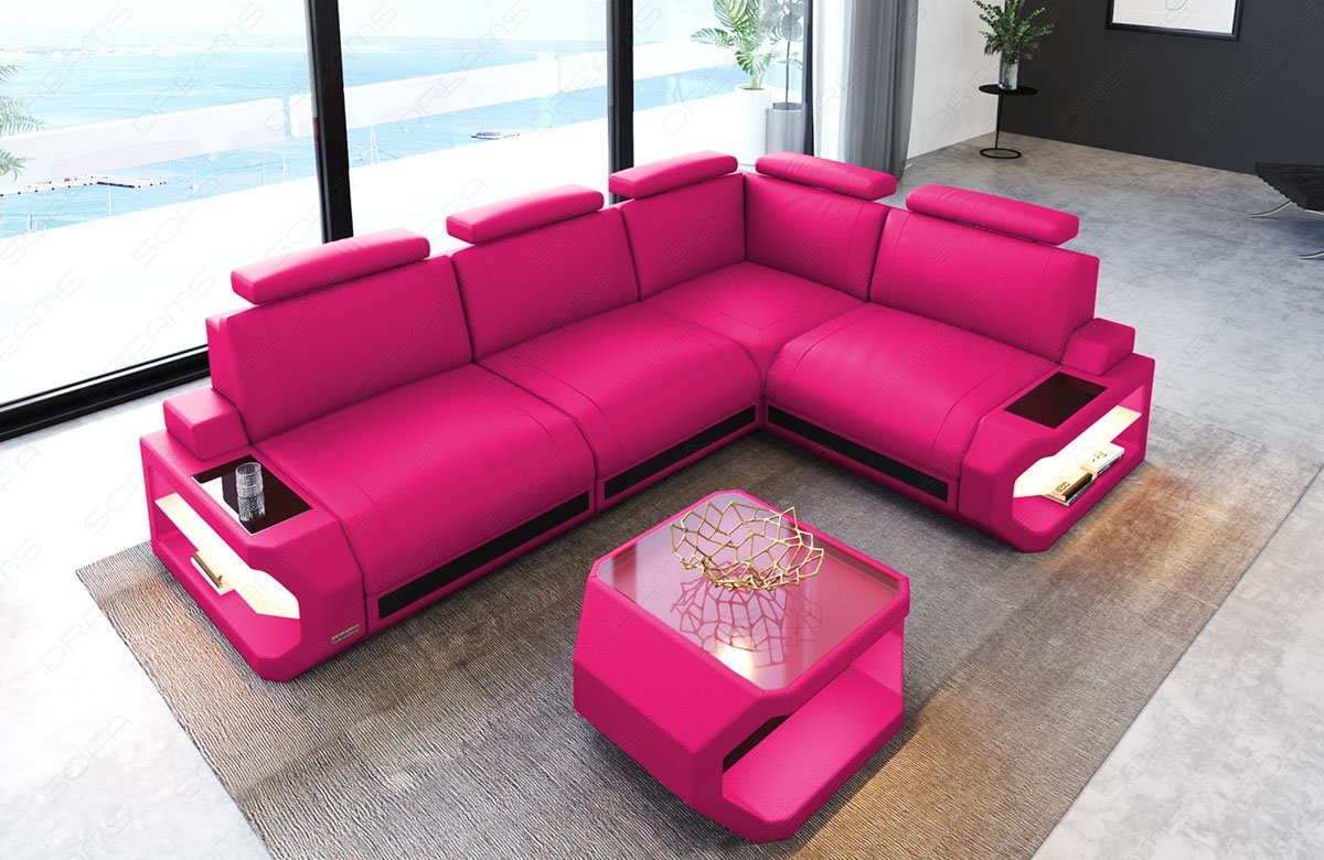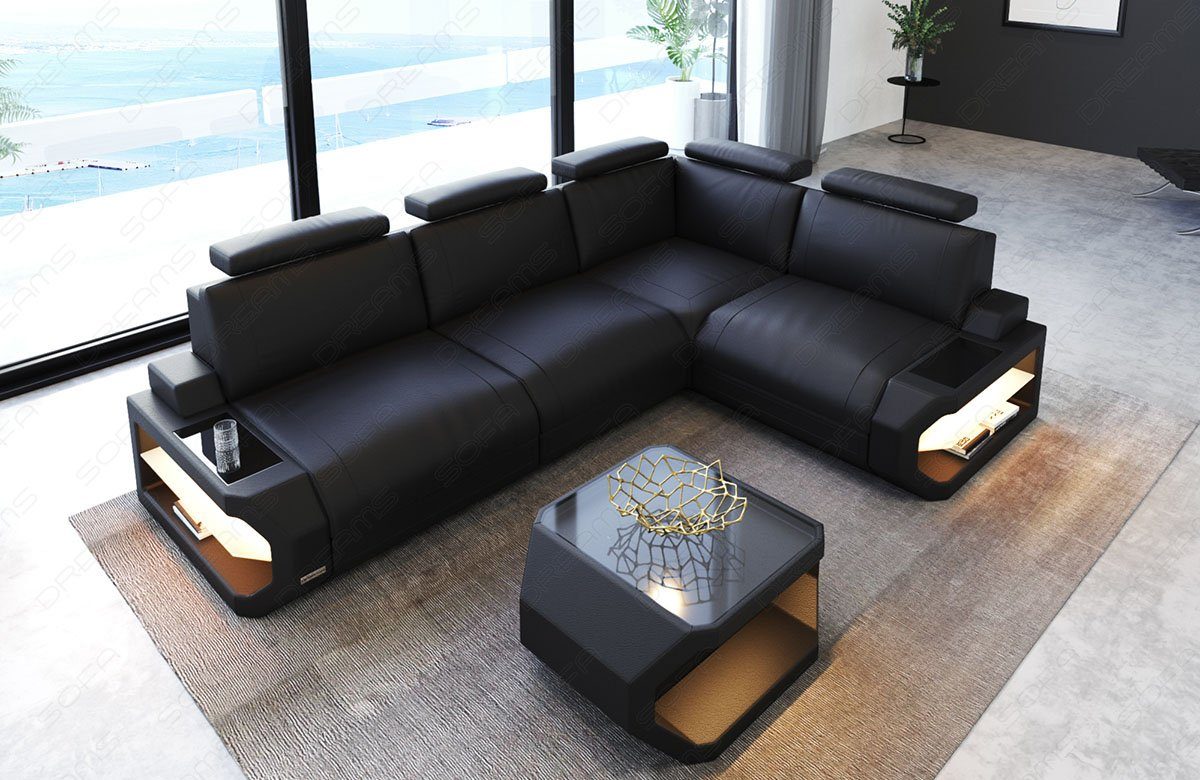 Das moderne kleine Ecksofa Siena L Form ist auch für kleine Wohnzimmer geeignet. Die Ausrichtung der Ecke ist wahlweise nach links oder rechts möglich. Das Gestell ist aus robustem Buchenholz gefertigt. Ein bequemes und weiches Sitzgefühl wird durch die schichtweise Polyether-Kaltschaumfüllung erreicht. Die Federung verteilt die Belastung flächenelastisch und vermeidet unschöne Sitzverformungen. In den Armlehnen sind Ablageflächen mit einer LED-Beleuchtung integriert. Dazu gehört eine Touchwheel-Fernbedienung, um Farben und Intensität der Beleuchtung zu regeln. Als Standardausführung wird dieses Sofa mit Kunstleder Premium bezogen. Dieses UV-beständige Leder hat eine feine Ledernarbung und einen weichen Textilrücken. Zudem stehen die Ausführung in Echt-/Kunstleder Mix, italienischem Echtleder und exklusivem Büffelleder für die Realisierung stilvollen Wohnens zur Verfügung. Das Sofa ist beliebig erweiterbar. USB-Anschlüsse und ein passender Couchtisch sind optional erhältlich.