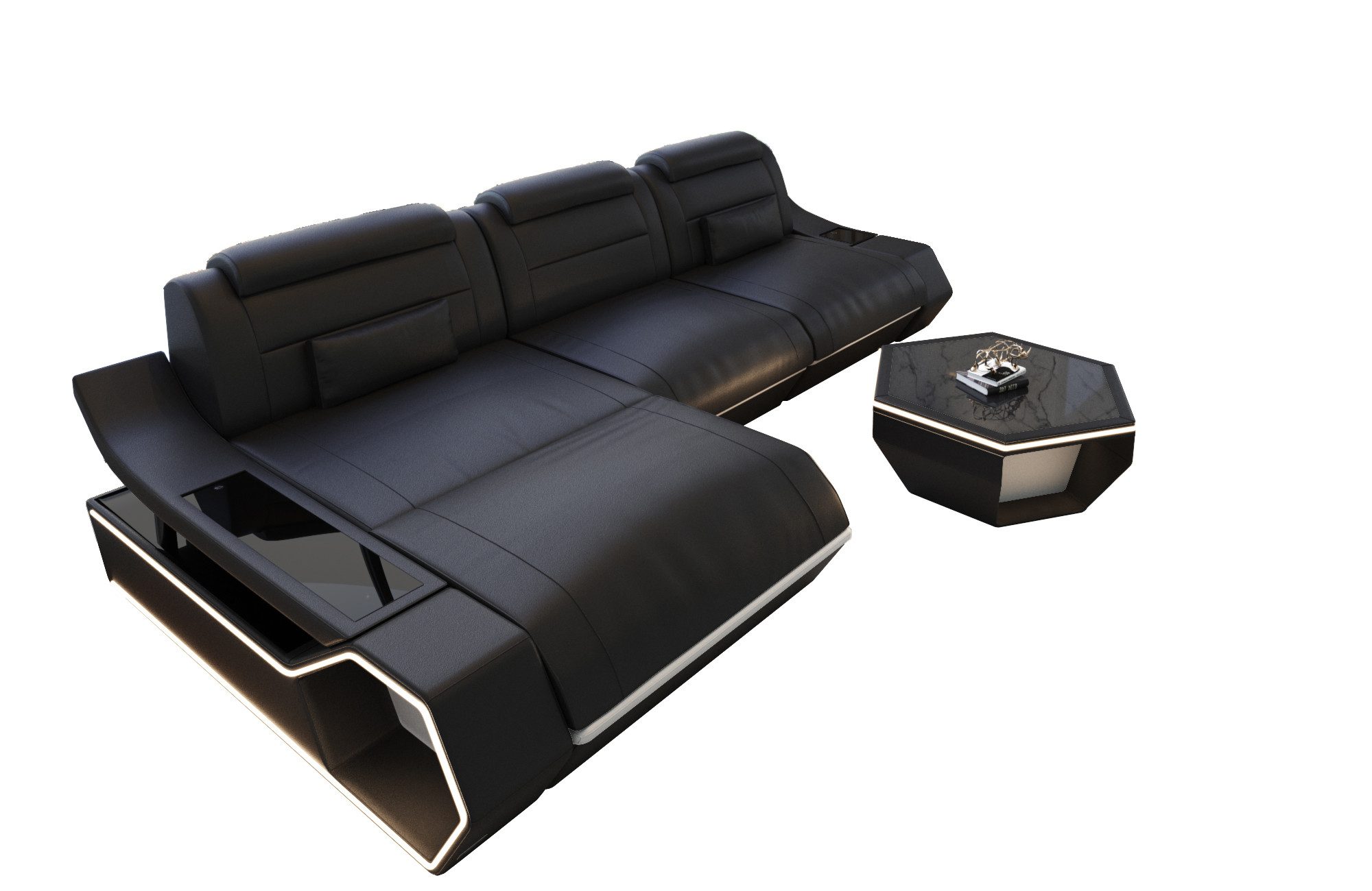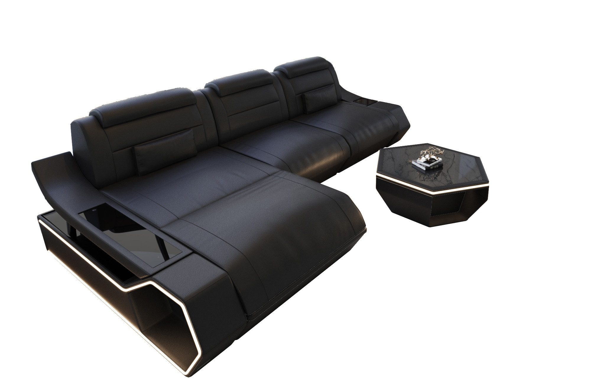 Das Ecksofa Toscano L Form mit Ottomane und Lederbezug bietet modernes Design in Kombination mit ausreichend gemütlichem Komfort für mehrere Personen. Durch die L-Form eignet sich dieses Ecksofa auch für Räume mit reduzierten Stellmöglichkeiten. Die Ottomane mit bequemer Liegefläche kann wahlweise links oder rechts ausgerichtet werden bei der Bestellung. Die drei Kopfstützen sind sehr komfortabel, aber nicht verstellbar. In den Seitenteilen mit unseren brandneu entwickelten Armlehnen-Design befinden sich Ablageflächen und eine LED-Beleuchtung. Das Material des Sofagestells besteht aus robustem, rissfestem Buchenholz. Das entspannte und gemütliche Sitzgefühl wird durch die Federung und die schichtweise aufgebaute Polyether-Kaltschaumfüllung erreicht. Bei Sofa Toscano können Sie bei der Bestellung aus vier verschiedenen Lederbezüge wählen. Zur Auswahl für den Bezug stehen unser Kunstleder Premium, ein Echt- Kunstleder Mix, Echtleder Premium und als Highlight unser besonders robustes Büffelleder Premium. Das Leder-Sofa ist in mehreren Farbkombinationen verfügbar. Optional ist die Ledercouch Toscano L Form auch mit Schlaffunktion erhältlich.