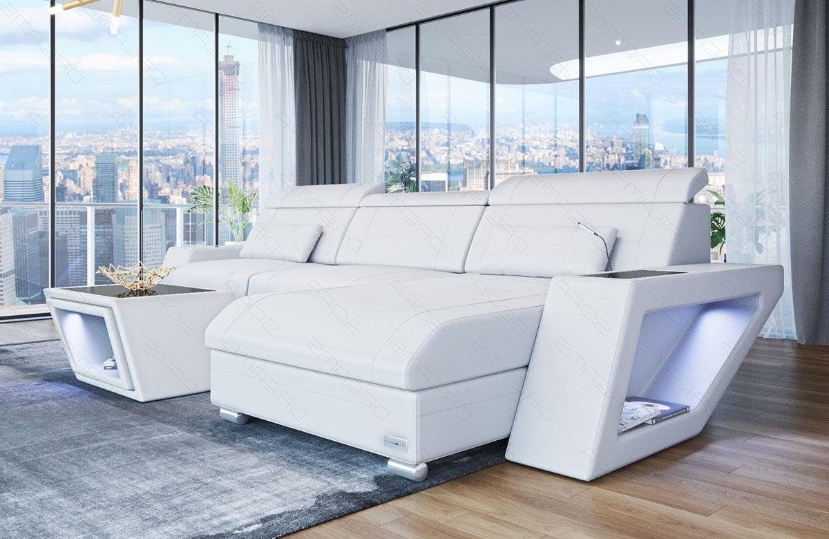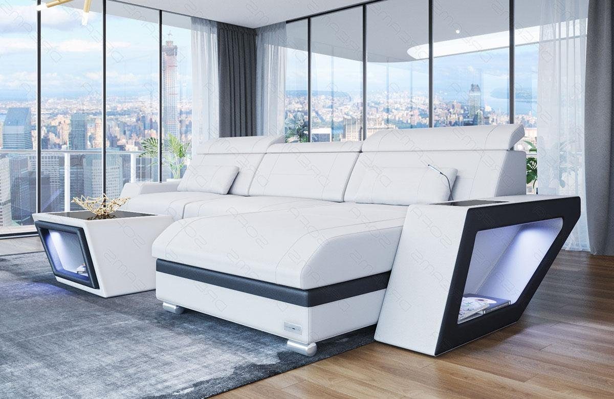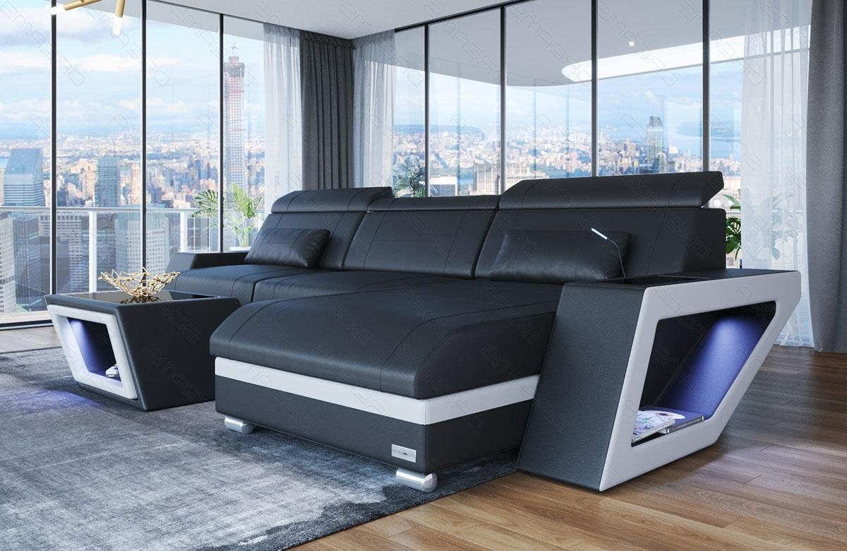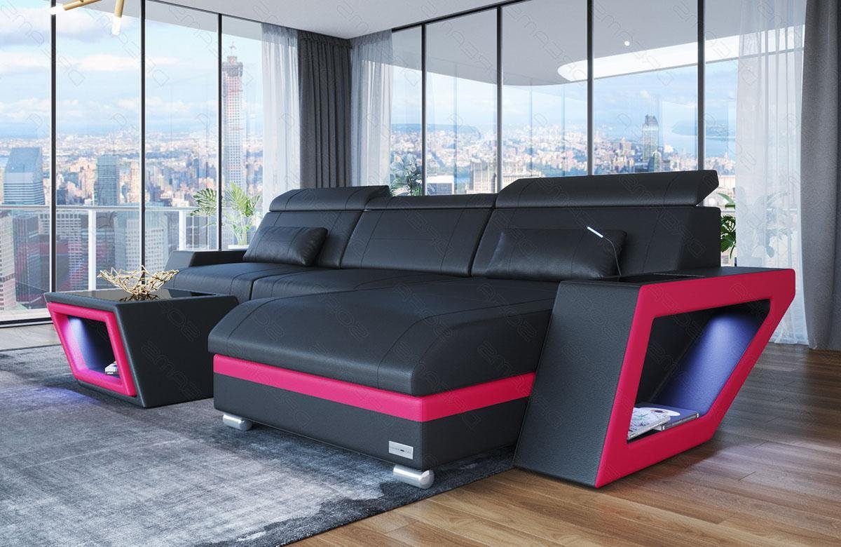 Die Eckcouch überzeugt mit einem durchdachten Design und einer hochwertigen Verarbeitung. Ein bequemer Vorteil dieser Designercouch sind die verstellbaren Kopfstützen. Sie können diese ganz einfach durch ein leichtes anheben auf ihre Wunschhöhe verstellen. Die Höhe kann je nach Sitz variiert werden. Eine weitere Besonderheit unserer Design- Wohnlandschaft Catania sind die Ablageflächen an den Seiten in schwarz- Hochglanz. Dort können Sie die Fernbedienung oder Getränke sicher Abstellen. Unter den Ablageflächen befinden sich Fächer mit viel Stauraum für Bücher und Zeitschriften, welche zudem mit einem modernen LED- Licht angestrahlt werden. Das Licht kann bequem per Handy App oder mit einer Touch Wheel Fernbedienung gesteuert werden. Sie können nicht nur zwischen vielen Farben wählen, sondern gleichzeitig auch noch die Helligkeit der LED´s bestimmen. Außerdem können viele Funktionen wie ein USB- Abschluss, Schlaffunktion, Elektrische Relax Funktion oder eine Handy Landestation optional ausgewählt werden.