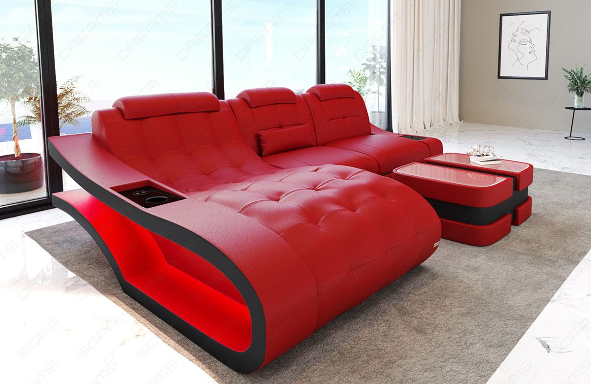 Ein besonderes Highlight des Elegante Sofas ist die integrierte LED-Beleuchtung, die mit einem stimmungsvollen Farbwechsel für eine besondere Atmosphäre sorgt. Die Beleuchtung lässt sich bequem per Fernbedienung steuern. Zusätzlich verfügt das Sofa über einen USB-Anschluss, sodass Sie Ihre Geräte jederzeit griffbereit aufladen können.
