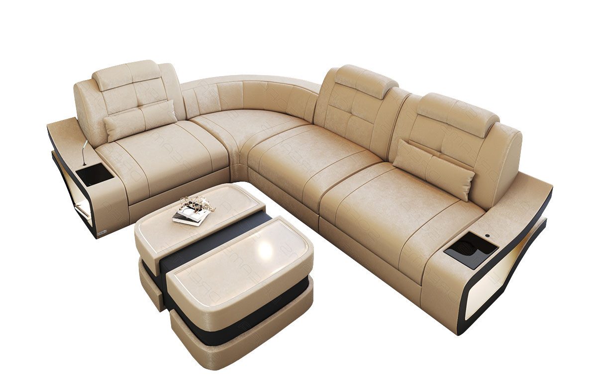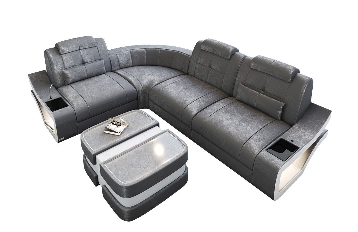 Das Ecksofa Elena L Form Stoff bietet mit seinen drei Sitzplätzen mehreren Personen Platz. Durch die L-Form eignet es sich auch für kleinere Wohnräume und die Wohnraumgestaltung unter Dachschrägen. Die bequemen Kopfstützen sind nicht verstellbar. In den geschwungenen Seitenteilen sind Ablageflächen und eine LED-Beleuchtung mit Farbwechsel und Fernbedienung integriert. Für das Sofagestell wird robustes Buchenholz mit hoher Rissfestigkeit verwendet. Eine Bonell-Federung in Kombination mit einer Polyether-Kaltschaumfüllung sorgt für ein angenehmes Sitzgefühl und beugt unschönen Sitzverformungen vor. Standardmäßig ist das Ecksofa mit einem optisch ansprechenden Strukturstoff Hugo in hochwertiger Qualität bezogen. Als Alternative zum Textilbezug stehen ein samtiger Stoffbezug und Ausführungen in Lederoptik sowie ein Mikrofaserbezug jeweils in vielen Farbmöglichkeiten zur Verfügung. Die Akzentfarbe für die Umrandungen der Seitenteile wird in Kunstleder ausgeführt.