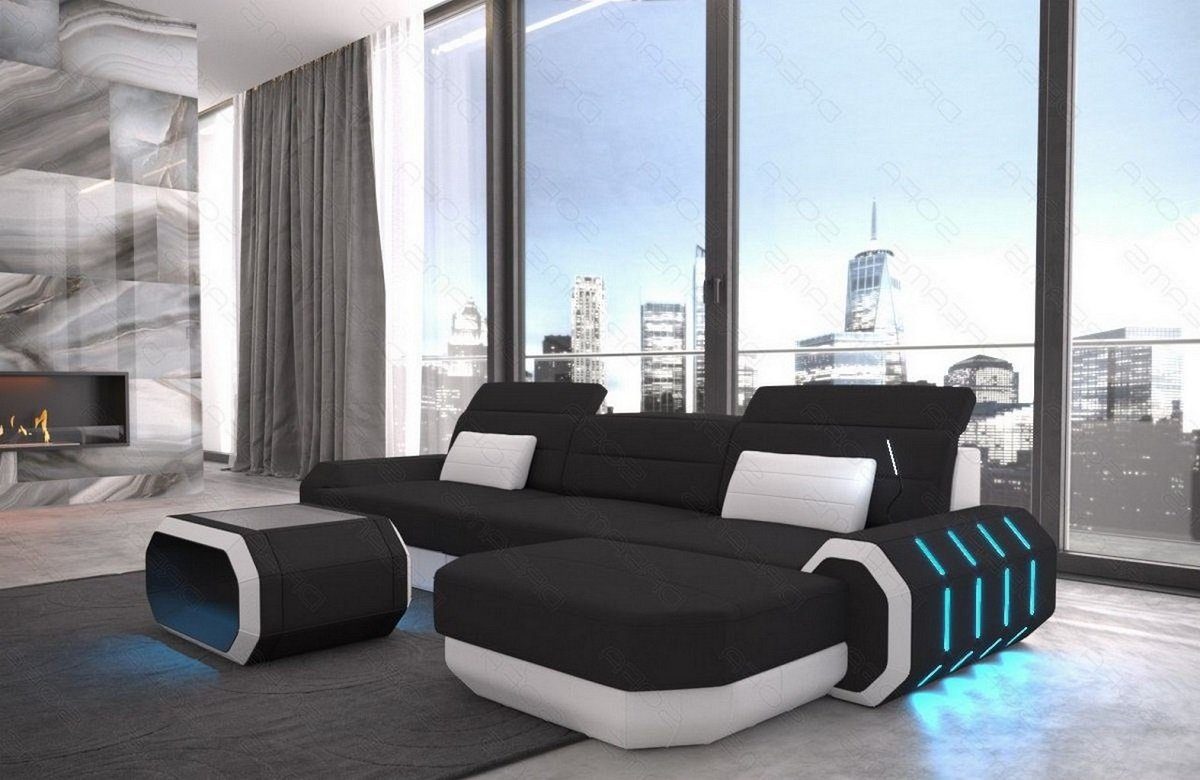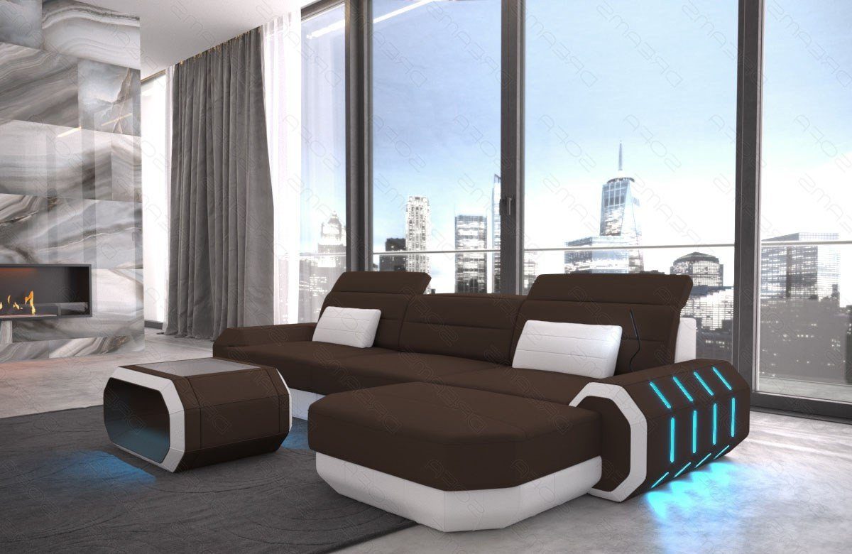 Das Mikrofaserstoff Ecksofa Roma L Form bringt ein futuristisches Design in moderne Wohnzimmer. Das gilt bereits tagsüber und noch mehr abends, wenn die LED-Beleuchtung in den achteckigen Armlehnen die Couch in atmosphärisches Licht taucht. Die Bedienung erfolgt über die mitgelieferte Touch-Wheel Fernbedienung - komfortabel im Sitzen und mit wenigen Fingerbewegungen. Der im Stoffsofa integrierte USB-Anschluss ist nicht nur für Technik-Fans ein Highlight. Спрятать Sie Laptop oder Smartphone in Zukunft einfach an Ihrem Sofa an. Flexible Rückenlehnen und eine Wellenfederung sorgen in jeder Situation für einen hohen Sitzkomfort. Die Polstercouch Roma L Form verfügt über einen USB-Anschluss und kann optional mit Schlaffunktion bestellt werden.