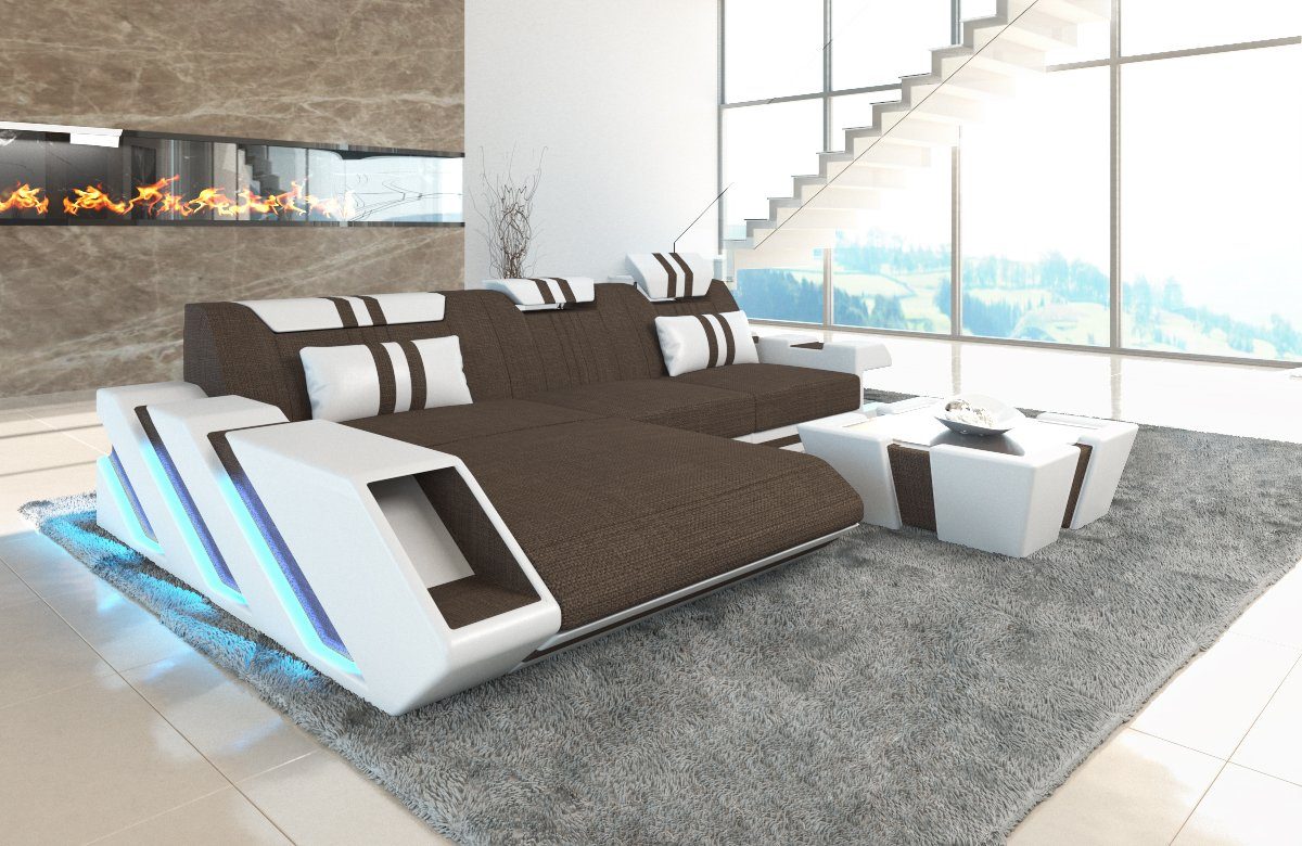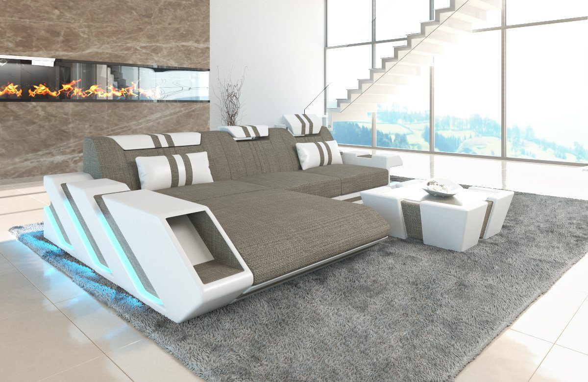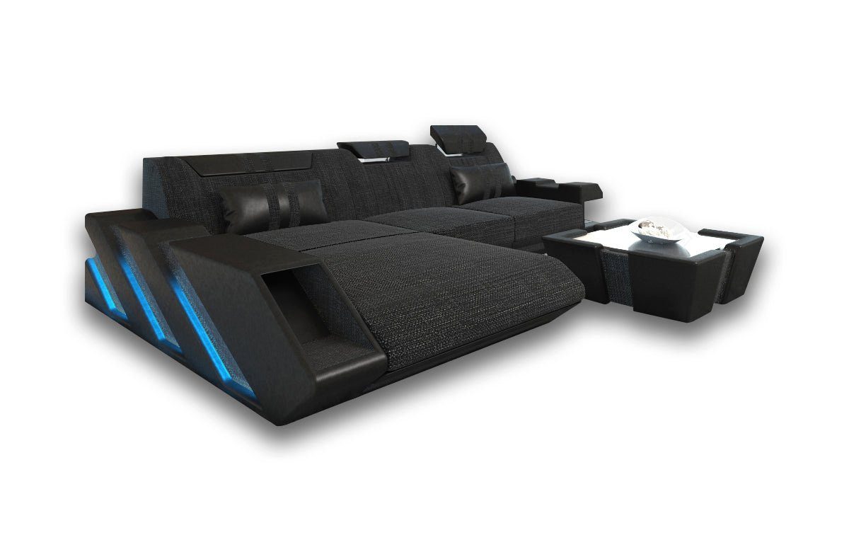 Die Stoffcouch Apollonia in L-Form ist ein kompromissloses Luxussofa mit viel Platz zum Liegen und Sitzen. Sein Design besticht vor allem durch die beiden extravagant geformten Armlehnen. Diese bieten Ihnen nicht nur zusätzlichen Stauraum. Sie sind außerdem mit einer LED-Beleuchtung ausgestattet, die je nach Wunsch in verschiedenen Farben erstrahlt. Eine Fingerbewegung auf der mitgelieferten Touch-Wheel-Fernbedienung genügt, um Ihr Sofa in dezentes Blau oder atmosphärisches Violett zu tauchen. Außerdem finden Sie in einer Armlehne einen praktischen USB-Anschluss – ideal um spontan Laptop oder Smartphone aufzuladen.