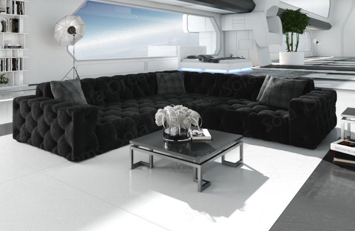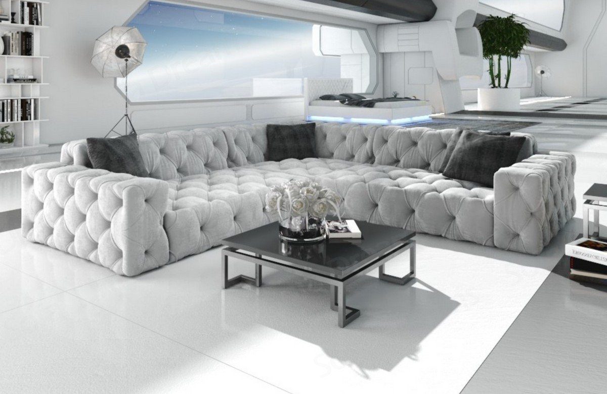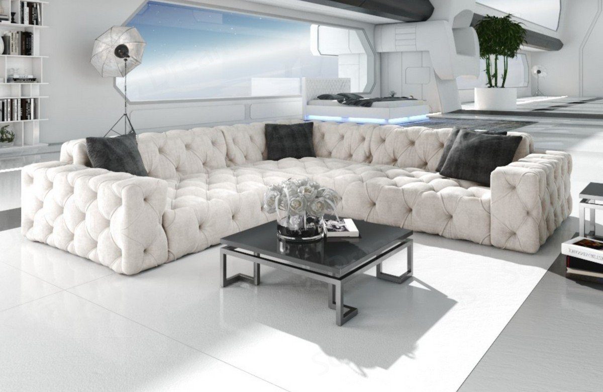 Das Samtstoff Sofa Menorca in der L Form mit seinem eleganten Chesterfield Muster ist das ideale Ecksofa auch für kleine Wohnzimmer. Auf der Polster Couch finden 4 Personen problemlos Platz. Die hochwertige Federung steigert nicht nur den Sitzkomfort, sondern beugt auch Verformungen vor, welche durch das Sitzen entstehen. Lernen Sie die Vorteile kennen, welche Sie durch Temperatur-unempfindliche Stoffe haben. Eine Stoffcouch hat den Vorteil, dass sie wenig empfindlich auf Temperaturschwankungen reagiert. Sie heizt sich im Sommer nicht unangenehm auf und kühlt im Winter nicht so stark ab. Die Eckcouch Menorca in der L-Form bieten wir Ihnen hier mit unserem Samtstoff Bezug an, der zudem auch noch wasserabweisend ist. Das Sofa wird ohne Zierkissen geliefert.