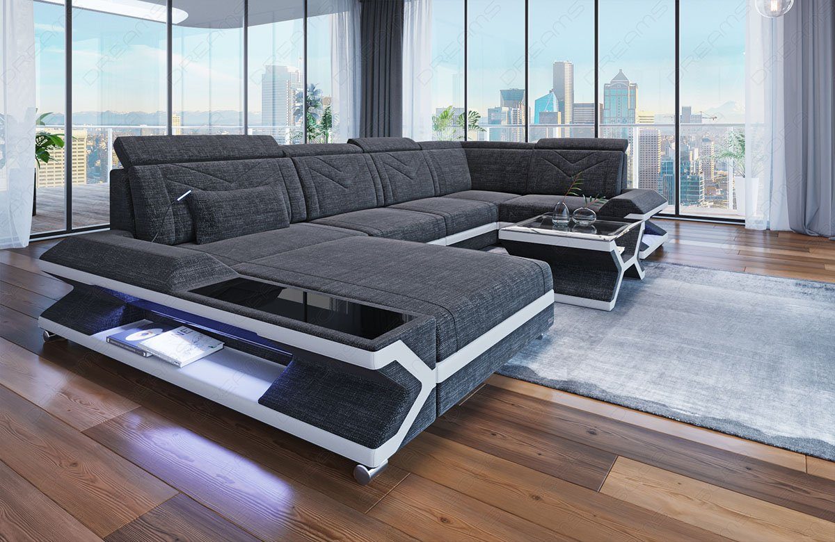 Diese Wohnlandschaft überzeugt mit einem durchdachten Design und einer hochwertigen Verarbeitung. Die Wohnlandschaft bietet durch die U Form und einer großen Ottomane ausreichend Platz für ihre Freunde und Familie. Ein bequemer Vorteil dieser Designercouch sind die verstellbaren Kopfstützen. Sie können diese ganz einfach durch ein leichtes anheben auf ihre Wunschhöhe verstellen. Die Höhe kann je nach Sitz variiert werden. Eine weitere Besonderheit unserer Design-Wohnlandschaft Napoli sind die schwarz Hochglanz lackierten Ablageflächen an den Seiten. Dort können Sie die Fernbedienung oder Getränke sicher abstellen. Unter den Ablageflächen befinden sich Fächer mit viel Stauraum für Bücher und Zeitschriften, welche zudem mit einem modernen LED-Licht angestrahlt werden. Das Licht kann bequem per Touch-Wheel Fernbedienung gesteuert werden. Sie können nicht nur zwischen vielen Farben wählen, sondern gleichzeitig auch noch die Helligkeit der LED Beleuchtung bestimmen. Außerdem können viele Funktionen wie ein oder zwei USB-Anschlüsse, Schlaffunktion oder eine elektrische Relax Funktion optional ausgewählt werden.