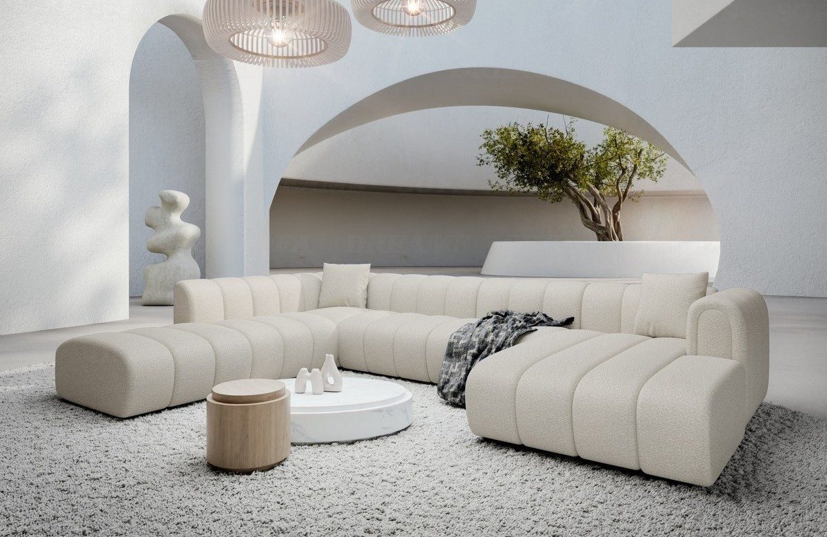 Der Boucléstoff liegt voll im Trend und begeistert durch seine unverwechselbare, unregelmäßige Oberflächenstruktur. Seine weich gewobenen Schlingen sorgen für eine kuschelige, gemütliche Haptik und ein besonderes visuelles Highlight. Bouclé wirkt einladend und verleiht dem Sofa ein modernes, skandinavisch inspiriertes Flair. Trotz seiner weichen Struktur ist der Stoff langlebig und robust, sodass er sich auch für Familien und Vielnutzer bestens eignet.