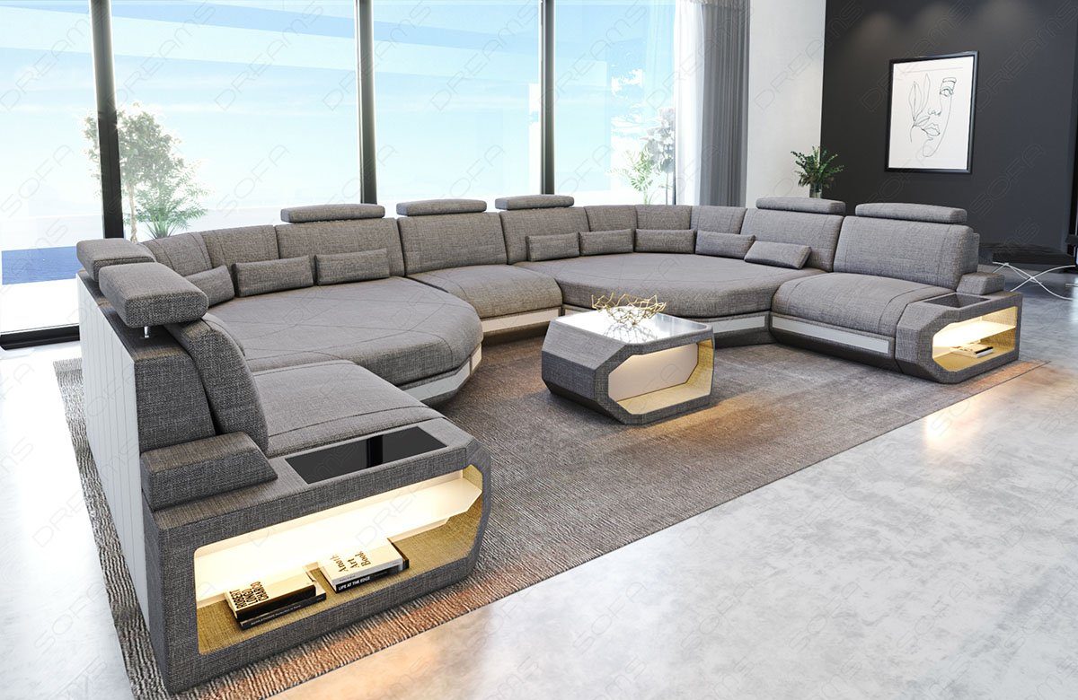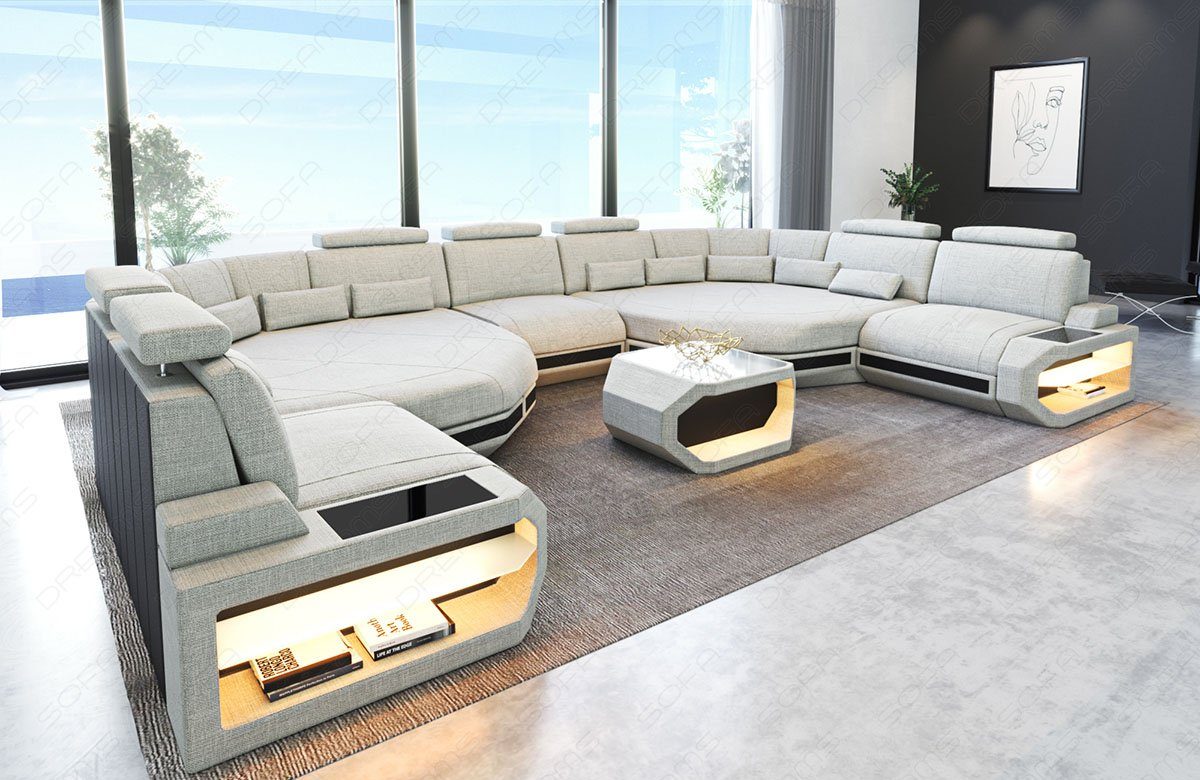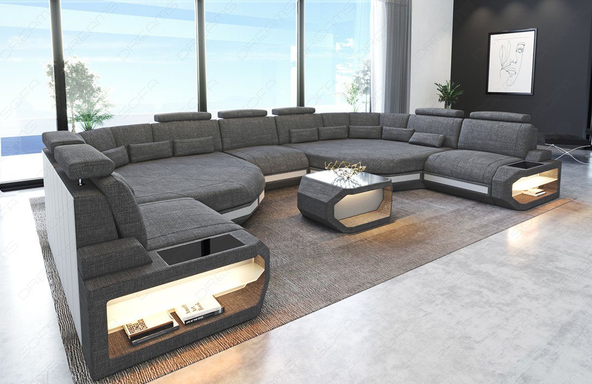 Die Stoff-Wohnlandschaft Asti XXL bietet allerdings nicht nur Komfort und Luxus, sondern überzeugt auch mit massiver Bauweise und Langlebigkeit. Dazu kommen praktische Features, wie die Ablageflächen an den Seiten, die eine vielfach verstellbare LED Beleuchtung und wahlweise auch USB-Anschlüsse haben.