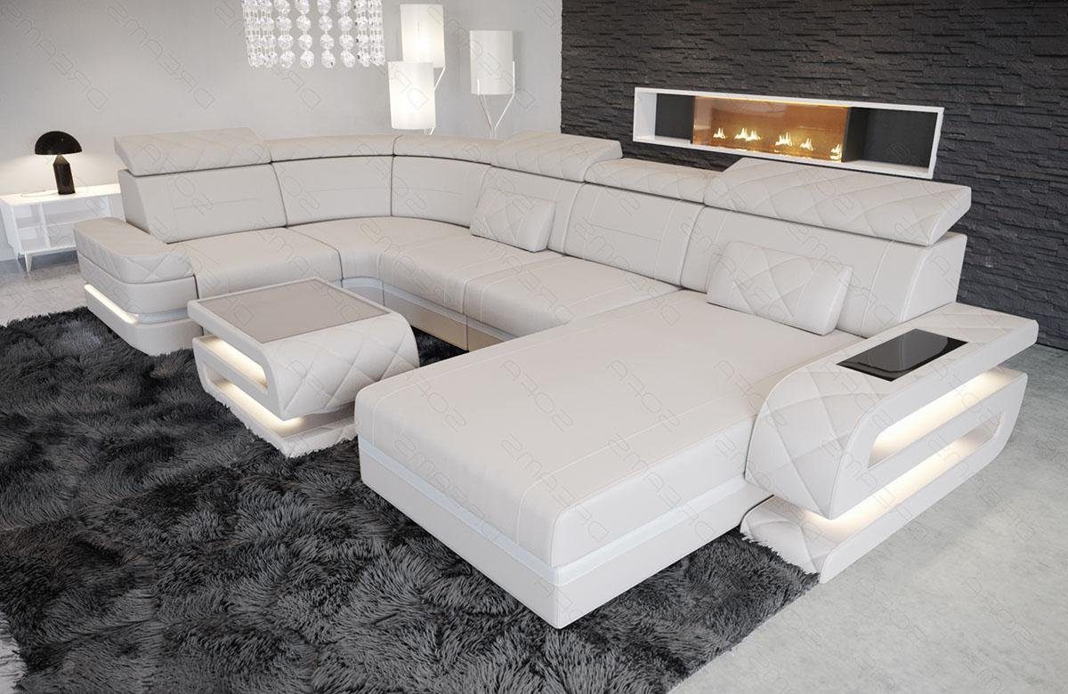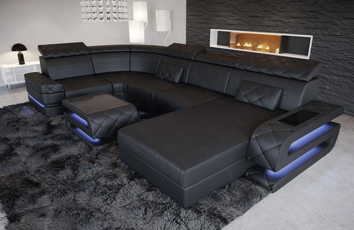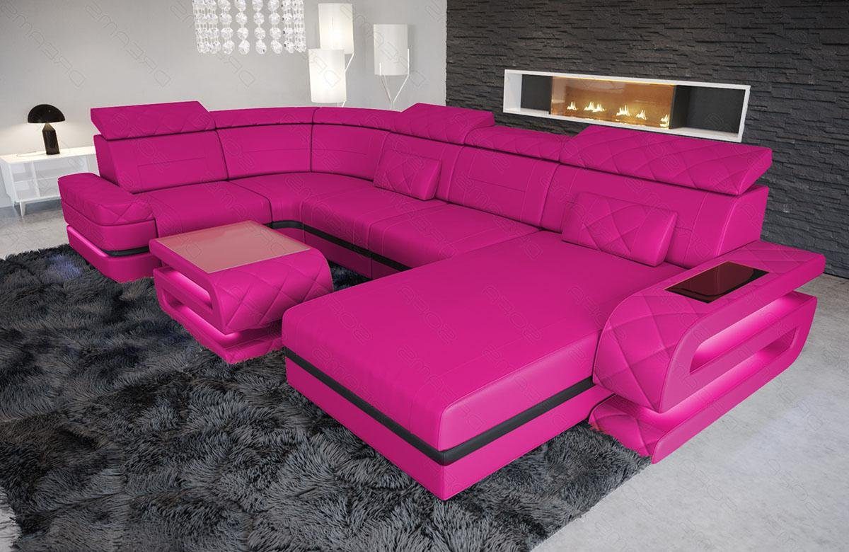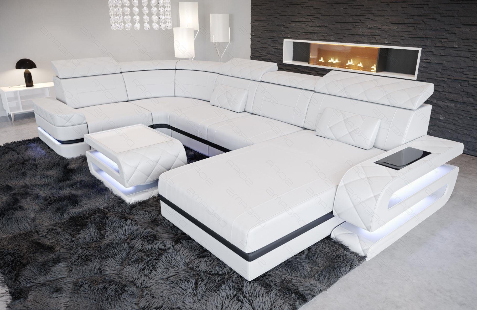 Sie suchen nach einer modernen Wohnlandschaft mit innovativem Design? Schauen Sie sich das elegant gesteppte Sofa doch etwas genauer an. Es bietet nicht nur Platz für die ganze Familie. In der kleinen Armlehne befindet sich zusätzlich ein aufklappbares Staufach. Das Ledersofa hat eine U Form und kommt in jeder Ausführung mit LED-Beleuchtung inkl. Fernbedienung mit Einstellungen für Farbe und Intensität. Die zwei Kopfstützen im Eckelement sind Zierde, die weiteren sind flexibel in der Höhe und Neigung einstellbar und sorgen dabei für noch mehr Komfort. Das Ledersofa wurde schichtweise mit einer Polyether-Kaltschaumfüllung aufgebaut und die Bonell Federung beugt Verformungen, welche durch das sitzen entstehen, vor. Das stabile Gestell wurde aus robustem und gegen Risse beständigem Buchenholz gefertigt. Außerdem bietet die Wohnlandschaft viele Farbmöglichkeiten, welche sowohl in der Haupt- als auch als Nebenfarbe auswählbar sind. Все Вариантыn sind in unterschiedlichen Farbkombinationen erhältlich. Bezüglich des Materials Ihres neuen Luxussofas, haben Sie die freie Wahl. Ob hochwertiges Kunst-, Echt-, oder dickes Büffelleder. Die Ausrichtung der Ottomane ist wählbar und zu jedem Sofa können Sie eine von zwei verschiedenen Zusatzelementen dazu bestellen. Sie haben die freie Auswahl. Ob Stauraum, kühlende Becherhalter, Induktions-Ladestation oder USB Anschlüsse.