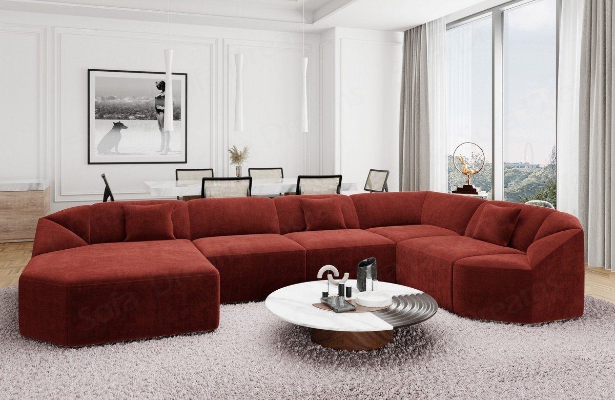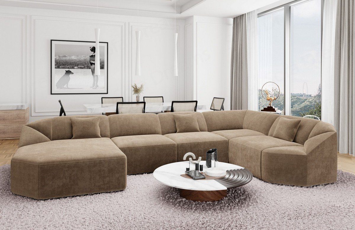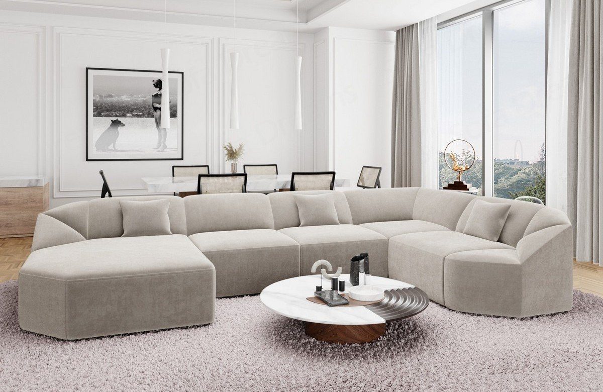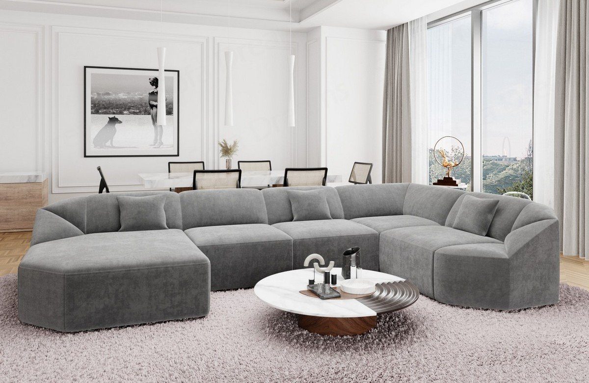 Willkommen zu Hause in der luxuriösen Welt der Wohnlandschaft Cabrera U-Form – ein Meisterwerk futuristischer Eleganz und zeitloser Gemütlichkeit. Diese exklusive Wohnlandschaft verleiht Ihrem Wohnraum einen Hauch von Avantgarde, kombiniert mit dem unwiderstehlichen Komfort, den Sie verdienen. Die futuristisch gestalteten Armlehnen sind nicht nur ein visuelles Highlight, sondern bieten auch eine ergonomische Unterstützung für entspannte Stunden. Die großzügige U-Form schafft eine einladende Atmosphäre, die zum Verweilen und Entspannen einlädt. Die gemütliche Ottomane lädt dazu ein, die Beine hochzulegen und den Alltag hinter sich zu lassen. Die Wohnlandschaft Cabrera bietet nicht nur Platz für die ganze Familie, sondern präsentiert auch individuelle Sitzmöglichkeiten. Mit drei einzelnen Sitzplätzen ist Flexibilität garantiert – ob gemeinsames Entspannen oder individuelle Ruheoasen, diese Couch passt sich Ihren Bedürfnissen an. Der Bezug aus weichem Samtstoff verleiht der Wohnlandschaft Cabrera nicht nur eine sinnliche Haptik, sondern auch eine edle Optik. Die samtige Oberfläche lädt dazu ein, sich hinzukuscheln und die angenehme Textur zu genießen. Die Couch wird so nicht nur zum Möbelstück, sondern zu einem Erlebnis für die Sinne. Das Besondere an der Wohnlandschaft Cabrera ist die Möglichkeit zur individuellen Gestaltung. Mit 10 verschiedenen, trendigen Farboptionen können Sie Ihr Sofa nach Ihrem persönlichen Stil kreieren. Ob klassisches Grau, zeitloses Beige oder auffälliges Smaragdgrün – Ihrer Kreativität sind keine Grenzen gesetzt. Erleben Sie zeitgemäßen Komfort und einzigartiges Design mit der Samtstoff Wohnlandschaft Cabrera U-Form. Entdecken Sie die Verschmelzung von Ästhetik und Gemütlichkeit in Ihrem Zuhause – eine Einladung zum Wohlfühlen und Entspannen.