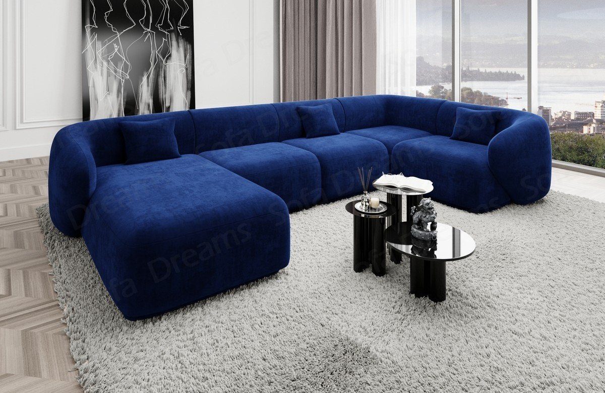 Die Design Stoff Wohnlandschaft Marbella U Form mit seinen schwungvollen Armlehnen und der Ottomane ist ein Loungesofa zum Wohlfühlen. Auf dem Stoff Sofa finden 6 Personen problemlos Platz. Die hochwertige Federung steigert nicht nur den Sitzkomfort, sondern beugt auch Verformungen vor, welche durch das Sitzen entstehen. Lernen Sie die Vorteile kennen, welche Sie durch Temperatur-unempfindliche Stoffe haben. Eine Stoffcouch hat den Vorteil, dass sie wenig empfindlich auf Temperaturschwankungen reagiert. Sie heizt sich im Sommer nicht unangenehm auf und kühlt im Winter nicht so stark ab. Das Sofa in der U-Form bieten wir Ihnen hier mit unserem Samtstoff Bezug an. Das Sofa wird mit 3 Zierkissen geliefert.