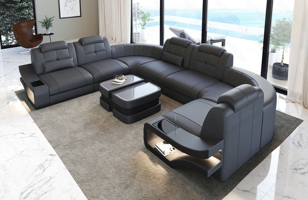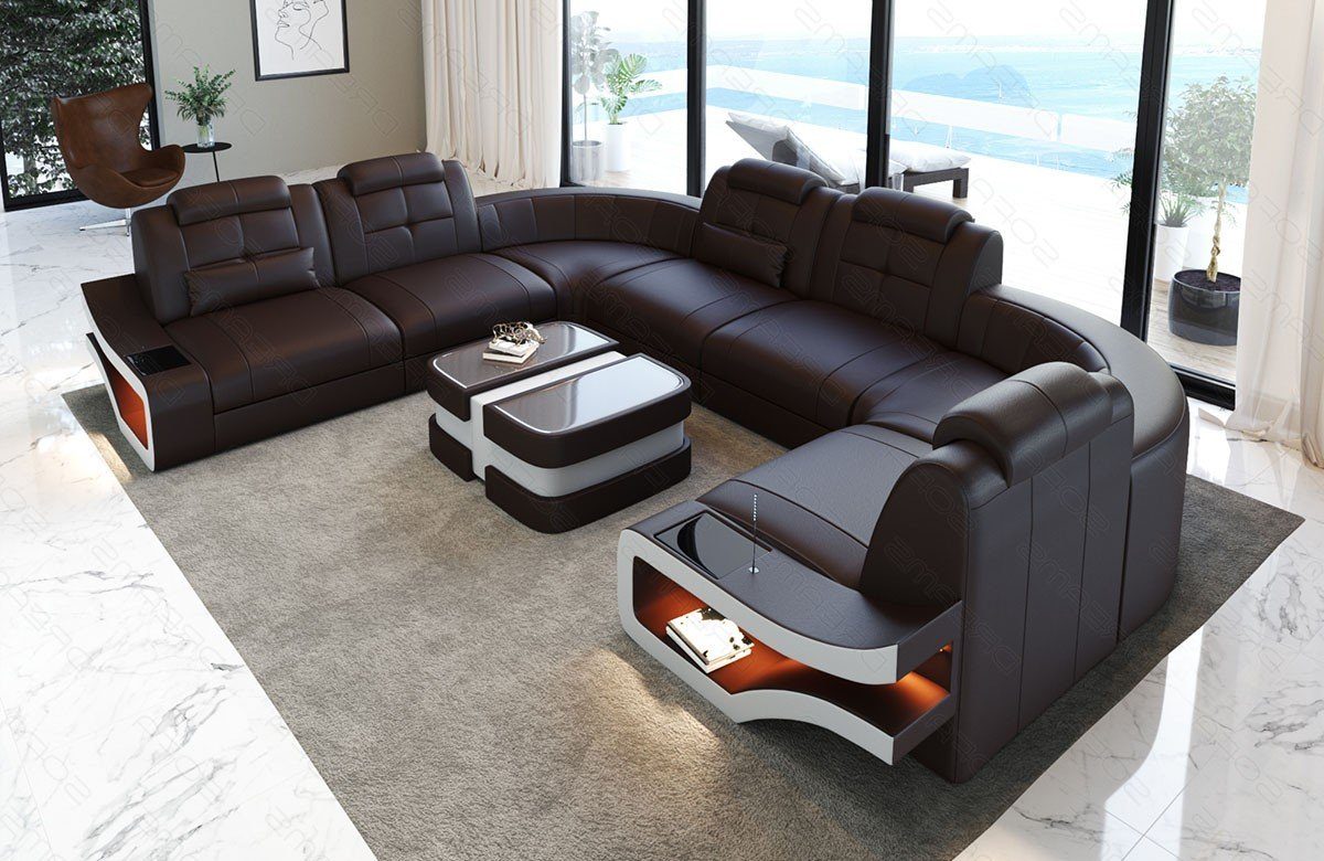 Die Leder Sofa Wohnlandschaft Elena U Form mit LED Beleuchtung wird das optische Highlight in Ihrem Wohnzimmer. Das Sofa überzeugt vor allem durch seine große Sitzplatzanzahl. Die Kopfstützen sind sehr komfortabel, aber nicht verstellbar. In den Seitenteilen mit geschwungenem Design befinden sich eine Ablagefläche und eine LED-Beleuchtung mit Farbwechsel und Fernbedienung. Das Material vom Sofagestell besteht aus robustem, rissfestem Buchenholz. Das entspannte und gemütliche Sitzgefühl wird durch die Bonell-Federung und die schichtweise aufgebaute Polyether-Kaltschaumfüllung erreicht. Edle Eleganz gewinnt das Ecksofa durch den Lederbezug, der in einer Kunstlederausführung oder in einem attraktiven Ledermix gefertigt wird. Ebenso stehen ein italienisches Leder und ein besonders exklusives Büffelleder zur Auswahl. Mit der Nebenfarbe werden die Umrandungen der LED-Beleuchtung gestaltet. Zusätzlich verfügt das Sofa über einen USB-Anschluss.