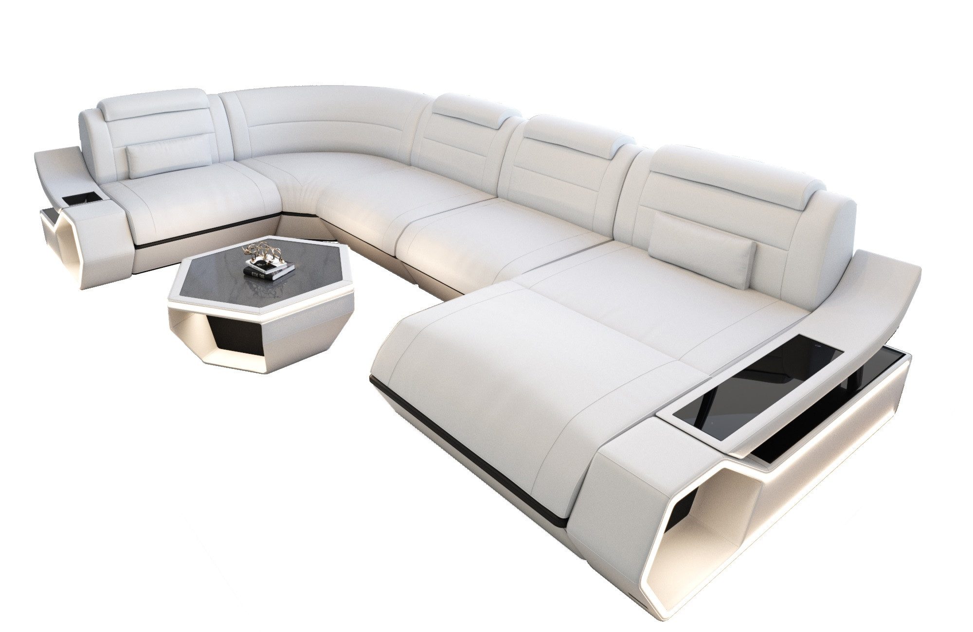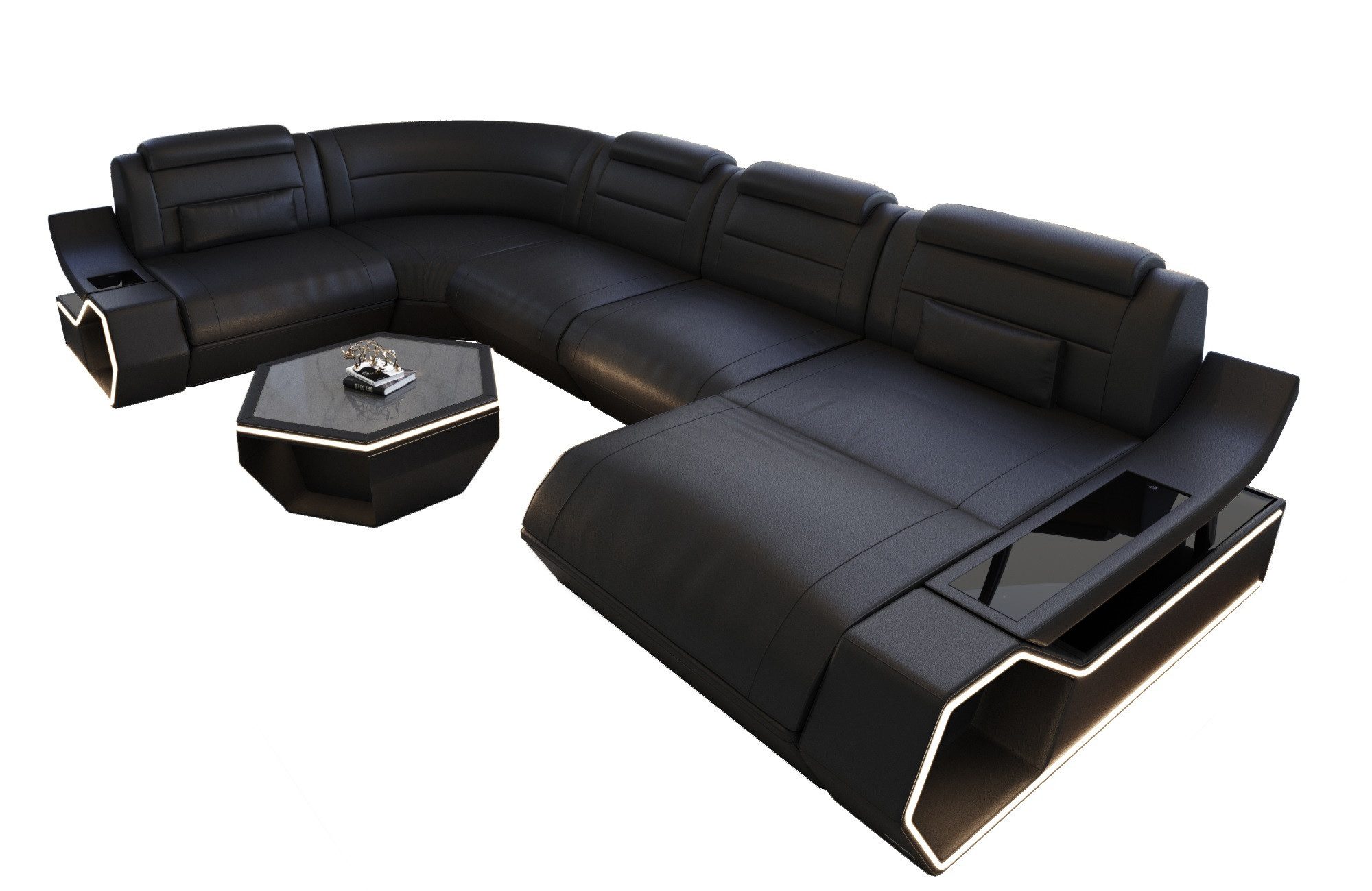Die Leder Sofa Wohnlandschaft Toscano U Form mit Ottomane und insgesamt 4 Sitzplätzen bietet Ihnen ein modernes Design mit ausreichend Sitzmöglichkeiten für mehrere Personen. Durch die U Form eignet sich diese Couch auch für gesellige Familienabende mit Freunden. Die Ottomane mit bequemer Liegefläche kann wahlweise links oder rechts ausgerichtet werden bei der Bestellung. Die vier Kopfstützen sind sehr komfortabel, aber nicht verstellbar. In den Seitenteilen mit unseren brandneu entwickelten Armlehnen-Design eine LED-Beleuchtung. Das Material des Sofagestells besteht aus robustem, rissfestem Buchenholz. Das entspannte und gemütliche Sitzgefühl wird durch die Federung und die schichtweise aufgebaute Polyether-Kaltschaumfüllung erreicht. Sie können diese einzigartige Wohnlandschaft in insgesamt vier verschiedenen Lederbezügen bestellen. Dieses Sofa ist optional um eine Schlaffunktion erweiterbar. Das Ledersofa Toscano U Form verfügt über einen USB-Anschluss.