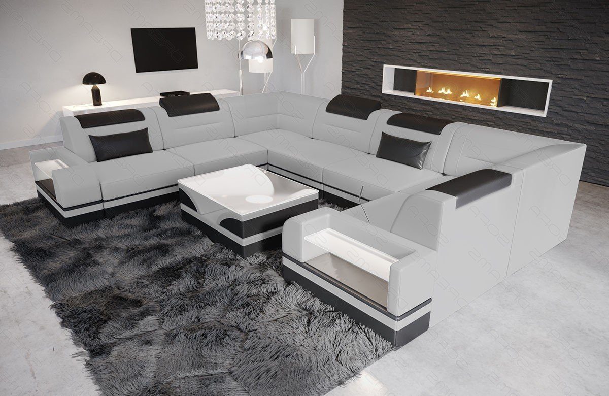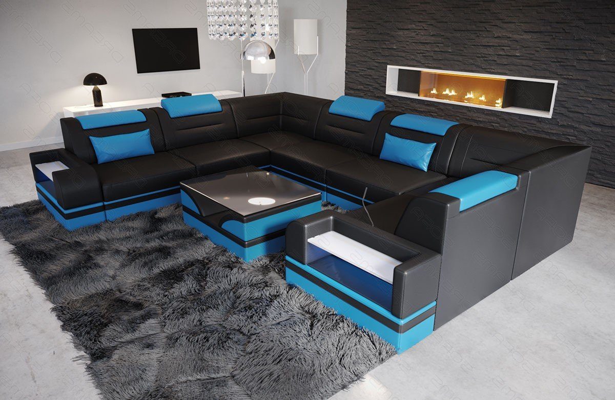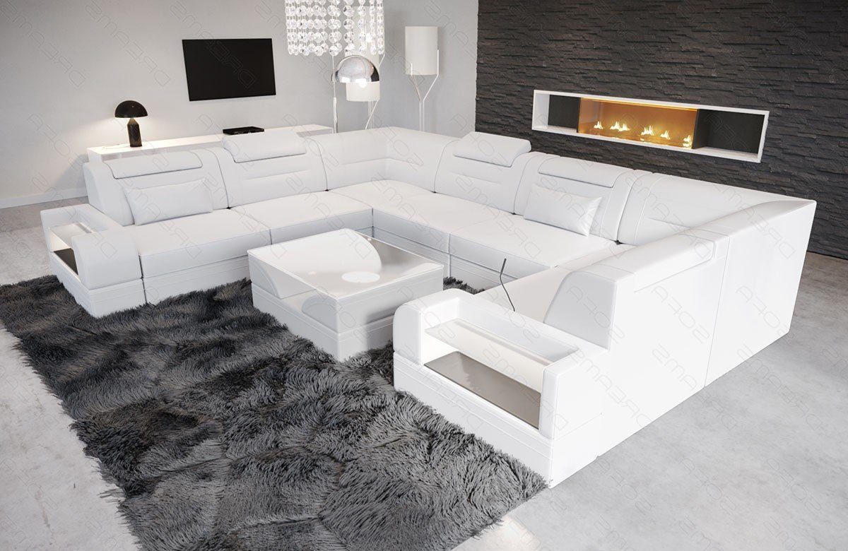 Die Leder Wohnlandschaft Trivento U Form überzeugt auch ohne Ottomane mit einem großen Platzangebot. Klare Linien bestimmen das Design dieser großen Wohnlandschaft in U-Form. Zwei längere Sitzflächen mit insgesamt 4 Sitzen, eine Sitzecke und eie einzelner Sitzplatz bieten Familie, Freunden und Gästen ausreichend Platz und ermöglichen es, sich in gemütlicher Runde auch gegenüberzusitzen. Die lange Seite kann nach rechts oder links ausgerichtet werden. Das Gestell ist aus rissfestem, robustem Buchenholz gearbeitet. Die Federung in Kombination mit einer Polyether-Kaltschaumfüllung gewährleistet höchsten Sitzkomfort. Die Kopfstützen sind in Höhe und Neigung verstellbar. Als Bezug stehen verschiedene Lederarten wie italienisches Echtleder, ein Ledermix oder auch ein dickes exklusives Büffelleder zur Verfügung. Die Wohnlandschaft kann komplett in einer Farbe gefertigt werden. Darüber hinaus bietet die Nebenfarbe, die an den Armlehnen, den Kopfstützen und im Sockelbereich Verwendung findet, die Möglichkeit, innenarchitektonische Akzente zu realisieren. In den beiden Armlehnen ist eine LED-Beleuchtung mit Farbwechsel integriert. Gesteuert wird die LED-Beleuchtung über die mitgelieferte Touch-Wheel Fernbedienung. Das Sofa verfügt über einen USB-Anschluss.