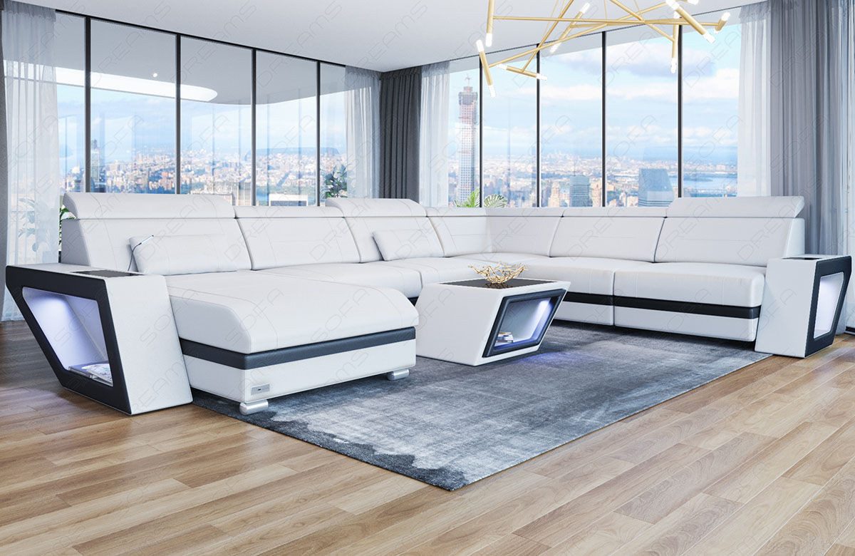 Ein besonderes Highlight des Catania Sofas ist die integrierte LED-Beleuchtung mit Farbwechsel, die per Fernbedienung gesteuert wird und für ein stimmungsvolles Ambiente sorgt. Zudem verfügt das Sofa über praktische USB-Anschlüsse, damit Sie Ihre Geräte immer griffbereit aufladen können.