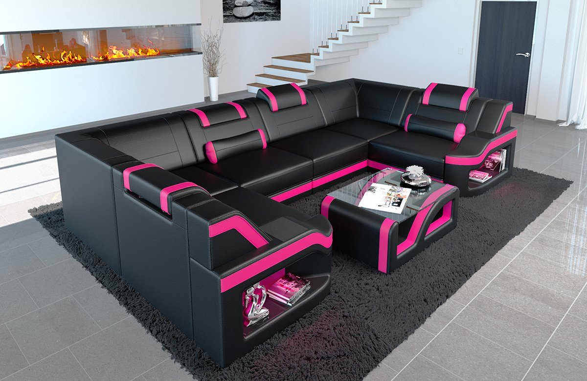 Die Leder Wohnlandschaft Padua in der U - Form überzeugt mit seinem großzügigen Platzangebot. Verbringen Sie einen gemütlichen Abend mit Familie und Freunden und genießen dabei den hervorragenden Komfort, den diese Designer Couch Ihnen bietet. Dafür sorgen die schichtweise aufgebaute Polyether-Kaltschaumfüllung und die zusätzliche Bonell Federung. Sollten Ihre Gäste über Nacht bleiben, können Sie ihnen, Dank der optionalen Bettfunktion, einen Schlafplatz anbieten. Verfügbar in drei verschiedenen Lederarten und einer Vielzahl an Farben, können Sie sich Ihr Traumsofa nach Ihren Vorstellungen zusammenstellen.