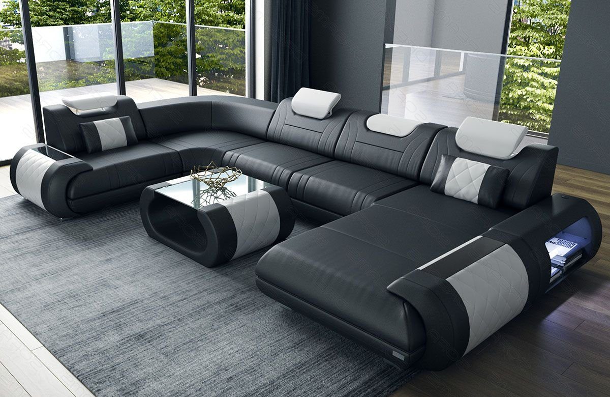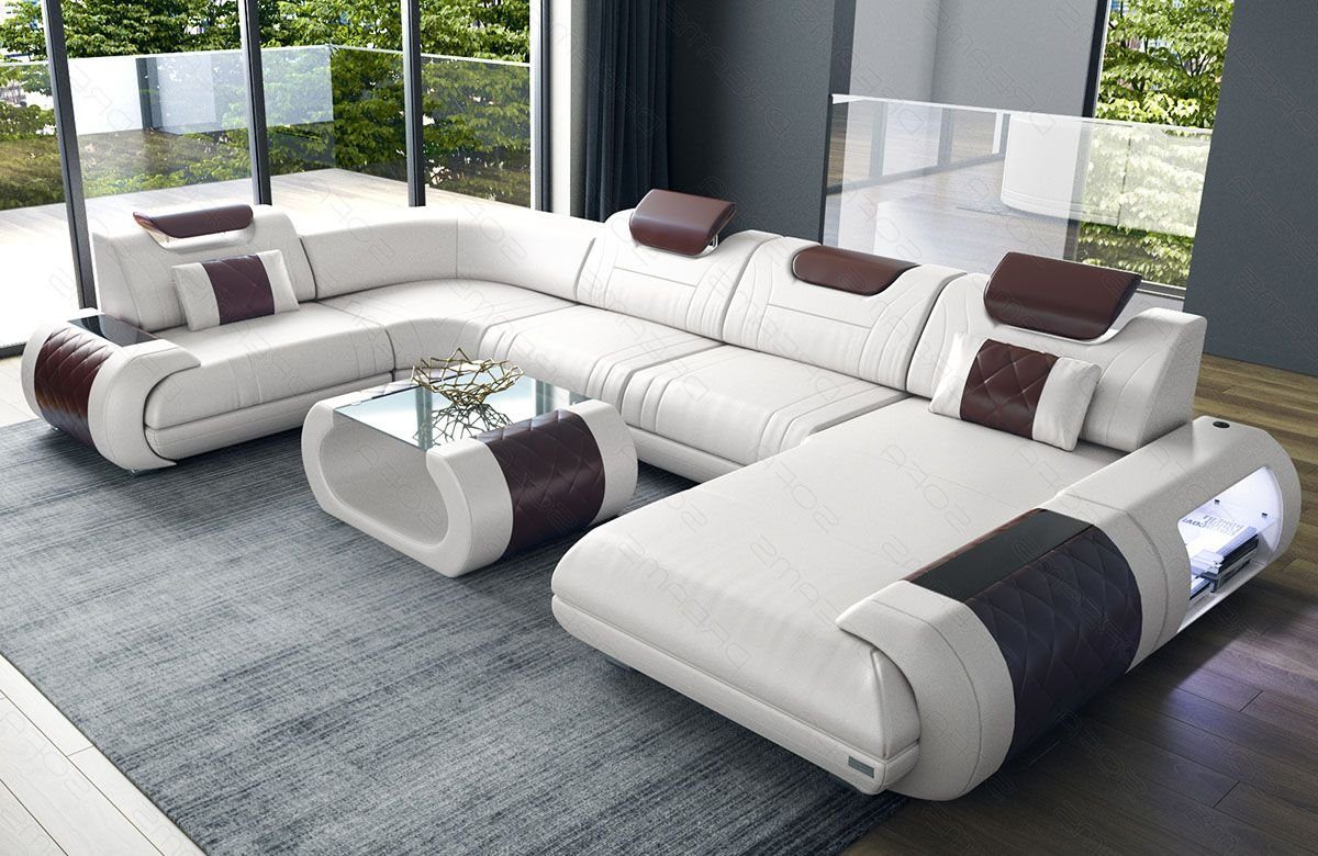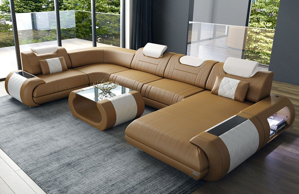 Ein gestepptes Design in den Armlehnen und hochwertige Lederbezüge sind ein starkes Gespann. Als dritte Zutat für Ihr neues Lieblingssofa schwebt Ihnen ein großes Platzangebot vor? Unsere Wohnlandschaft Rimini in U-Form erfüllt in jeder Beziehung hohe Ansprüche. Ausgestattet mit einer herrschaftlichen Liegefläche und vielen bequemen Sitzgelegenheiten, eignet sie sich hervorragend als zentraler Ort für gesellige Abende. Dann kommt auch die in den Seiten integrierte LED-Beleuchtung zur Geltung. Dank Touch-Wheel-Fernbedienung wechseln Sie mit einer Fingerbewegung die Lichtfarbe - ein Highlight auf jeder Party. Apropos Farbe: Das Ledersofa Rimini erhalten Sie mit unterschiedlichen Bezügen in verschiedenen Farben.