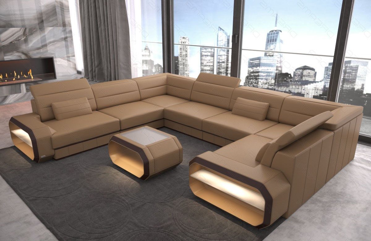 Entdecken Sie die luxuriöse Wohnlandschaft Verona in U-Form von Sofa Dreams, die modernes Design mit höchstem Komfort vereint. Dieses exklusive Sofa ist in verschiedenen hochwertigen Materialien erhältlich, darunter Echtleder, Büffelleder, Kunstleder oder eine Kombination aus Echtleder und Kunstleder. Das Modell bietet eine Reihe an individuellen Anpassungsmöglichkeiten, um perfekt in Ihr Wohnambiente zu passen.