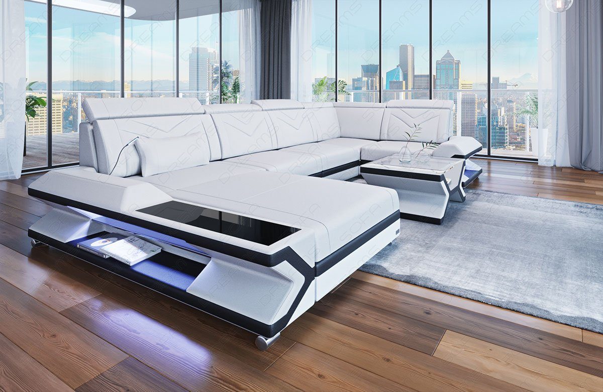 Ein Highlight des Napoli Sofas ist die integrierte LED-Beleuchtung mit Farbwechsel-Option. Mit der beiliegenden Fernbedienung lassen sich die Farben je nach Stimmung oder Anlass wechseln, wodurch eine individuelle Atmosphäre im Raum geschaffen wird. Der praktische USB-Anschluss ergänzt die Funktionalität des Sofas, indem er ein einfaches Aufladen von elektronischen Geräten ermöglicht.