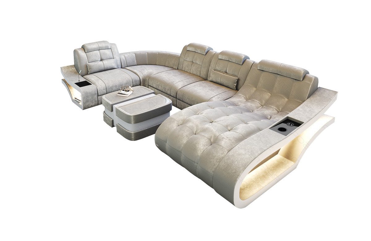 Die Polster Wohnlandschaft Elegante U Form in modernem Design bildet den eleganten Mittelpunkt des Wohnbereichs. Drei Sitzelemente und eine Sitzecke bieten zusammen mit der Ottomane viel Platz für Familie und Gäste. Die Ottomane mit Steppung und großzügiger Liegefläche kann wahlweise nach links oder rechts ausgerichtet werden. Die Seitenteile verfügen über eine Ablagefläche und eine integrierte LED-Beleuchtung mit Fernbedienung, die für stimmungsvolles Licht sorgt. Die Kopfstützen sind komfortabel, aber nicht verstellbar. Das Gestell dieser Wohnlandschaft ist aus robustem rissfestem Buchenholz gefertigt. Eine Bonell-Federung und eine schichtweise aufgebaute Polyether-Kaltschaumfüllung garantieren ein bequemes Sitzgefühl. In der Standardausführung ist die Wohnlandschaft mit einem hochwertigen Strukturstoff bezogen, der durch seine hohe Verschleißfestigkeit überzeugt. Samtartige Stoffe, ein Stoff mit Mikrofaserausrüstung und ein Bezug in Wildleder-Optik stehen ebenso in vielen Farbvariationen zur Verfügung. Die Akzentfarbe für die Umrandungen der Seitenteile wird in Kunstleder ausgeführt. Diese Wohnlandschaft ist mit einer Bettfunktion und USB-Anschlüssen in der Armlehne erweiterbar.