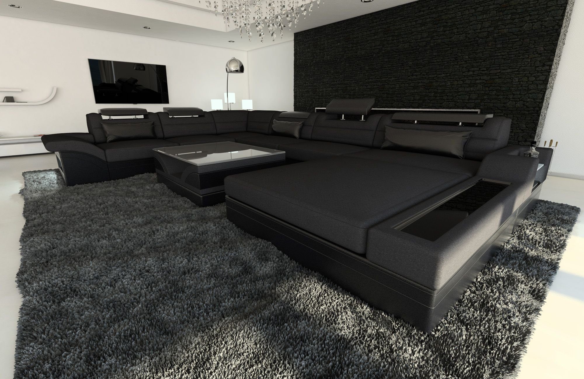 Die Wohnlandschaft Mezzo XXL ist ein wahres Platzwunder und ein Eyecatcher für jedes Wohnzimmer. Die Ottomane bietet genug Platz für zwei Personen, um sich gemütlich auszustrecken. Für Sitzkomfort sorgen die Kopfstützen, die sich in der Höhe anpassen lassen. Außerdem besitzt die Wohnlandschaft Mezzo an einer Seite einen integrierten Stauraum mit Beleuchtung – der ideale Ort, um einen edlen Tropfen aufzubewahren. Das geradlinige Design in Kombination mit Grau und Schwarz verleiht dem Designersofa eine ausgesprochen edle Optik, ohne erdrückend zu wirken. Mit diesem Möbelstück machen Sie garantiert Eindruck auf Ihre Gäste.