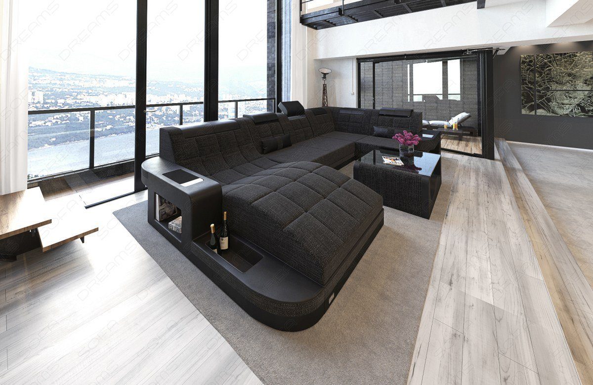Ein Stoffsofa hat viele positive Eigenschaften. Die Wohnlandschaft Wave in U-Form vereint diese in einem Designersofa, kombiniert mit einer luxuriösen Ausstattung. Genießen Sie den Feierabend auf Sitz- und Liegeflächen mit einer erstklassigen Wellen-Federung und verstellbaren Kopfstützen. Ein Handgriff genügt, um die Flasche Wein aus den Staufächern in den Seiten des Sofas zu holen oder sie auf einer der Hochglanz-Ablageflächen abzustellen. Ihnen ist nach einer atmosphärischen Beleuchtung zumute? Die Wohnlandschaft Wave besitzt eine LED-Beleuchtung mit Farbwechsel. Auch dafür müssen Sie nicht aufstehen. Wir liefern die entsprechende Fernbedienung gleich mit.