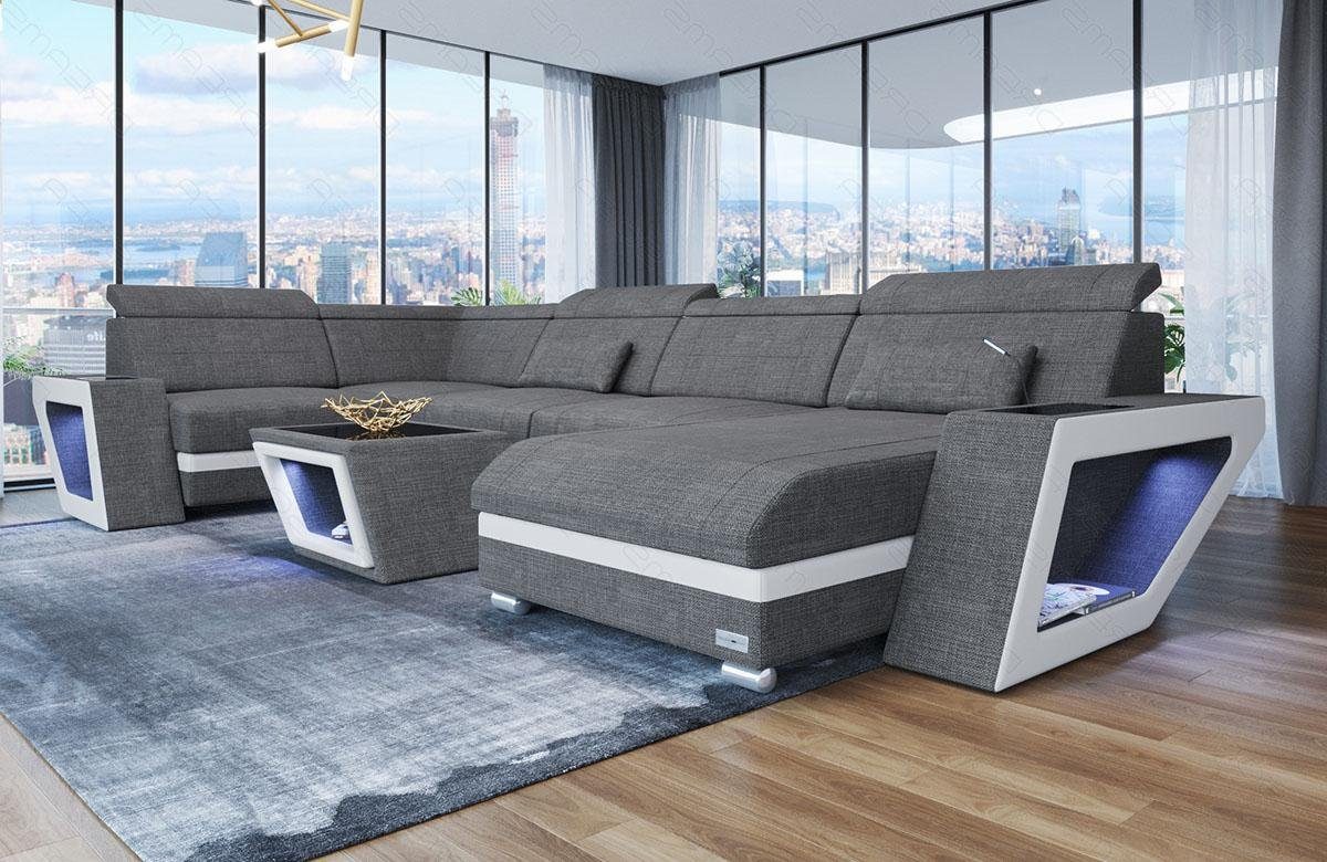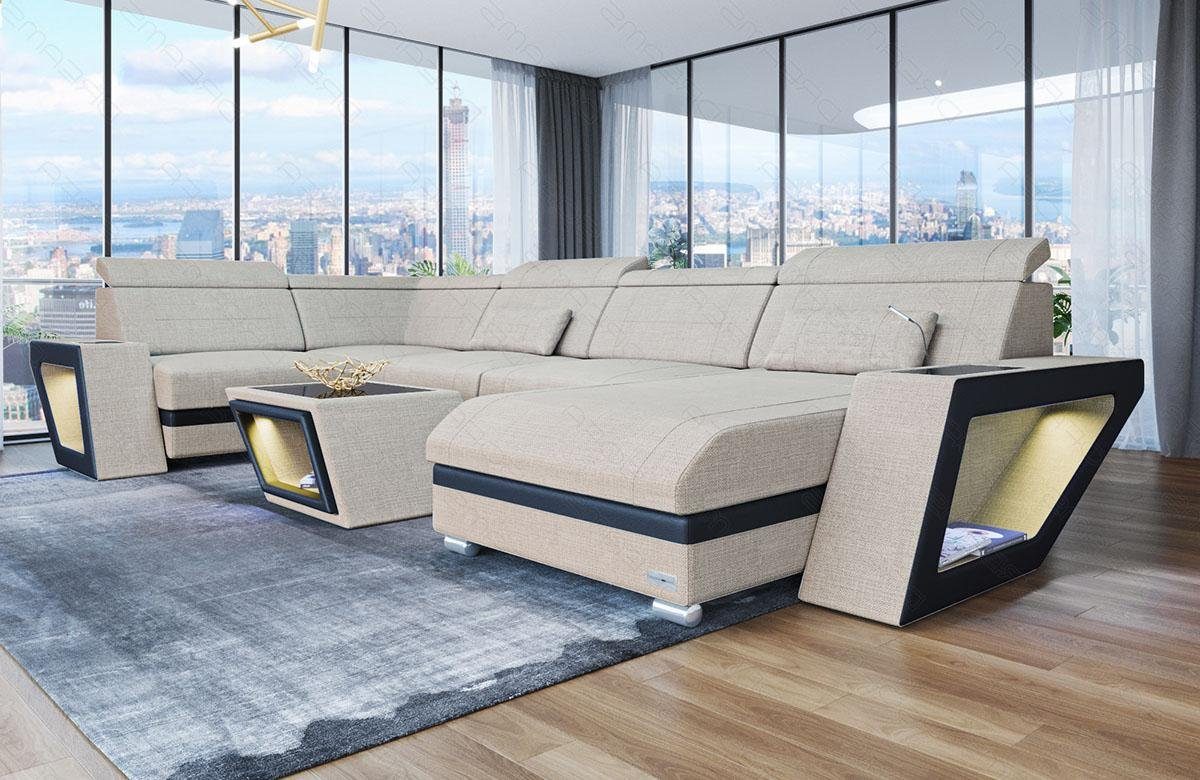 Diese Wohnlandschaft überzeugt mit einem durchdachten Design und einer hochwertigen Verarbeitung. Die Wohnlandschaft bietet durch die U Form und einer großen Ottomane ausreichend Platz für ihre Freunde und Familie. Ein bequemer Vorteil dieser Designercouch sind die verstellbaren Kopfstützen. Sie können diese ganz einfach durch ein leichtes anheben auf ihre Wunschhöhe verstellen. Die Höhe kann je nach Sitz variiert werden. Eine weitere Besonderheit unserer Design-Wohnlandschaft Catania sind die Ablageflächen an den Seiten in Schwarz Hochglanz. Dort können Sie die Fernbedienung oder Getränke sicher abstellen. Unter den Ablageflächen befinden sich Fächer mit Stauraum, welche zudem mit einem modernen LED-Licht angestrahlt werden. Das Licht kann bequem mit der Touch-Wheel Fernbedienung gesteuert werden. Sie können nicht nur zwischen vielen Farben wählen, sondern gleichzeitig auch noch die Helligkeit der LEDs bestimmen. Außerdem können viele Funktionen wie ein USB-Anschluss, Schlaffunktion, elektrische Relax Funktion oder eine Handy-Ladestation optional ausgewählt werden.