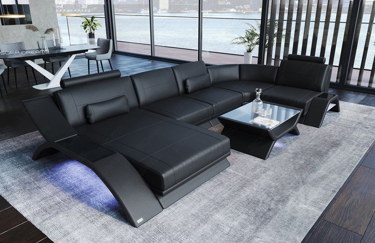 Auf der edlen Wohnlandschaft Calabria findet die ganze Familie Platz zum Entspannen. Mit dem großen Sofa im Wohnzimmer kann man es sich so richtig gemütlich machen und viele schöne Stunden in Gesellschaft genießen. Ob bei einem Spiele- oder Filmeabend, einer Geburtstagsfeier oder einem Geschäftsessen, die Wohnlandschaft bietet höchsten Komfort und vermittelt Wohlbehagen und Gemütlichkeit. Ein absolutes Highlight sind die Armlehnen in modern gestalteter Form, die zusätzlich über eine Ablagefläche verfügen. Die schwarzen Ablageflächen in hochglänzender Optik können zum Abstellen von allerlei Dingen wie Getränken, Snacks oder Elektrogeräten genutzt werden. Unter den Armlehnen befindet sich neben einem versteckten Stauraum außerdem eine LED- Beleuchtung, die das Sofa perfekt in Szene setzt. Durch eine praktische Fernbedienung kann das Licht nach Belieben in den verschiedensten Farben leuchten. Die großzügige Ottomane lädt zum Entspannen ein und bietet eine gemütliche Alternative zum Bett, um sich nach einem harten Arbeitstag mal so richtig lang zu machen. Ein absolutes Highlight sind die multifunktionalen Kopfstützen, die innerhalb von wenigen Sekunden ganz einfach auf die gewünschte Höhe verstellt werden können. Optionale Funktionen wie USB- Anschlüsse an der Wohnlandschaft machen das Gesamtbild perfekt. Auch eine Multifunktionskonsole mit ausfahrbarer Steckdosenleiste und Stauraum im inneren trägt zu einem stimmigen Design bei. In unserem Online- Katalog können Sie aus einer Vielzahl an schönen Haupt- und Nebenfarben wählen und Ihre neue Wohnlandschaft genau so gestalten, wie Sie es sich schon immer vorgestellt haben. Nicht nur die Farben, auch die Ausrichtung der Ottomane und das Material können Sie frei wählen. Warten Sie nicht länger sondern verschönern Sie Ihr Wohnzimmer mit der Wohnlandschaft Calabria von Sofa Dreams ganz nach Ihrem Geschmack! Passende Zierkissen zu diesem Sofa sind optional erhältlich.