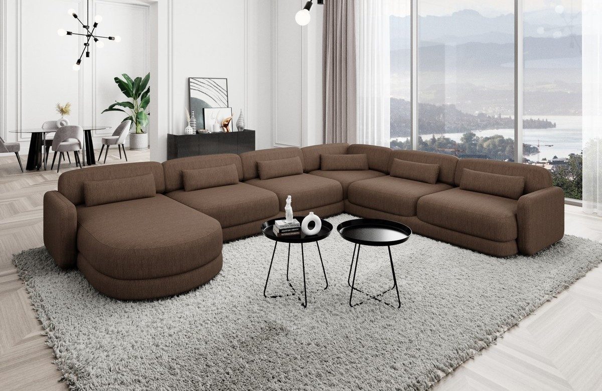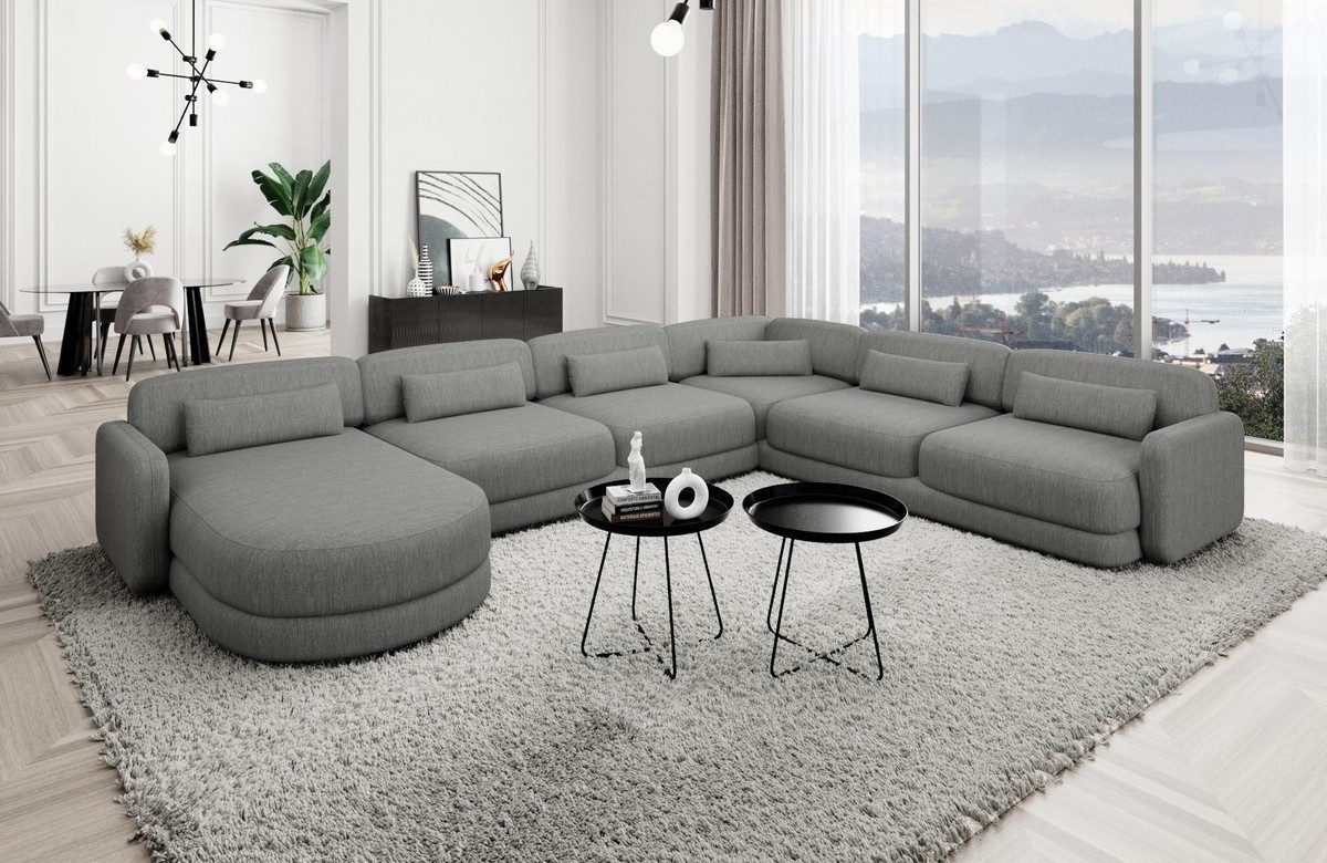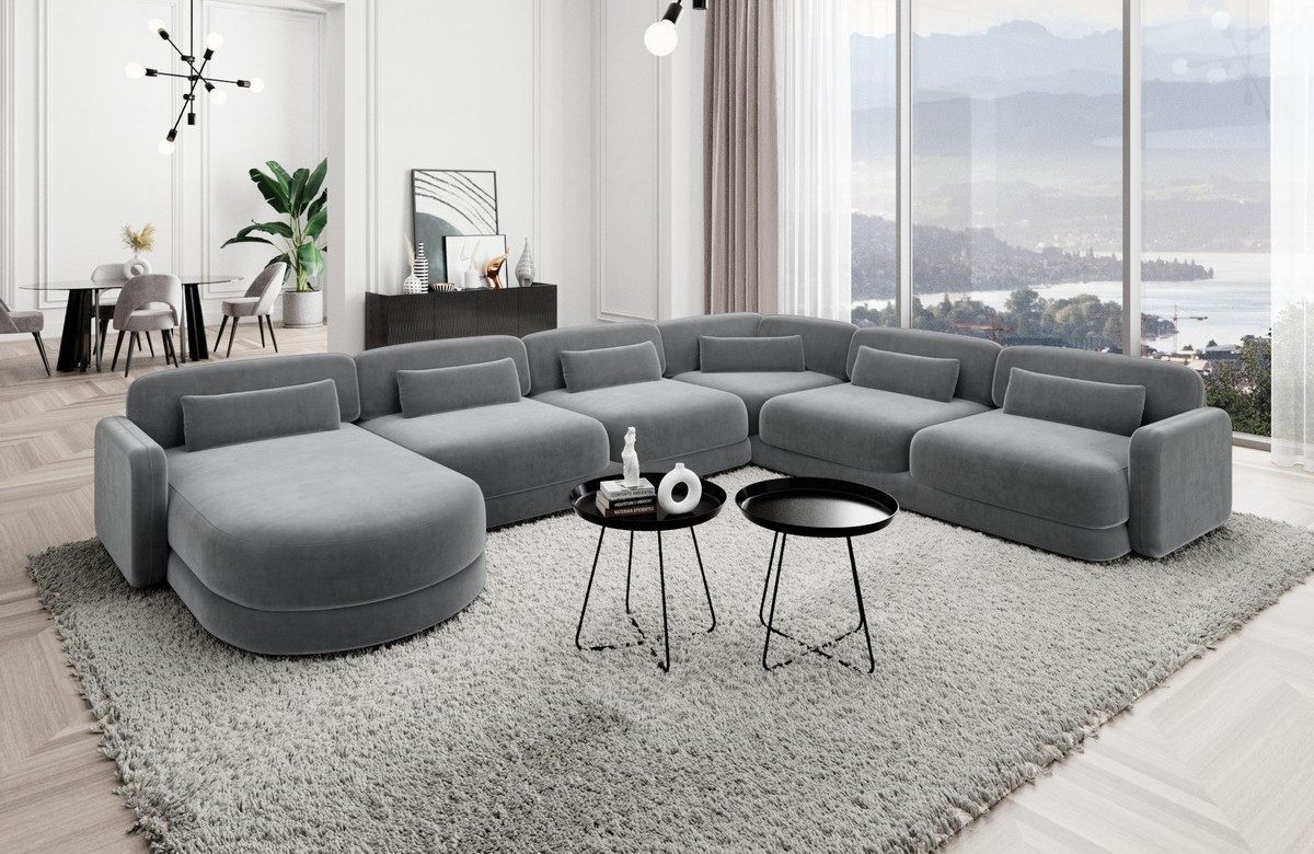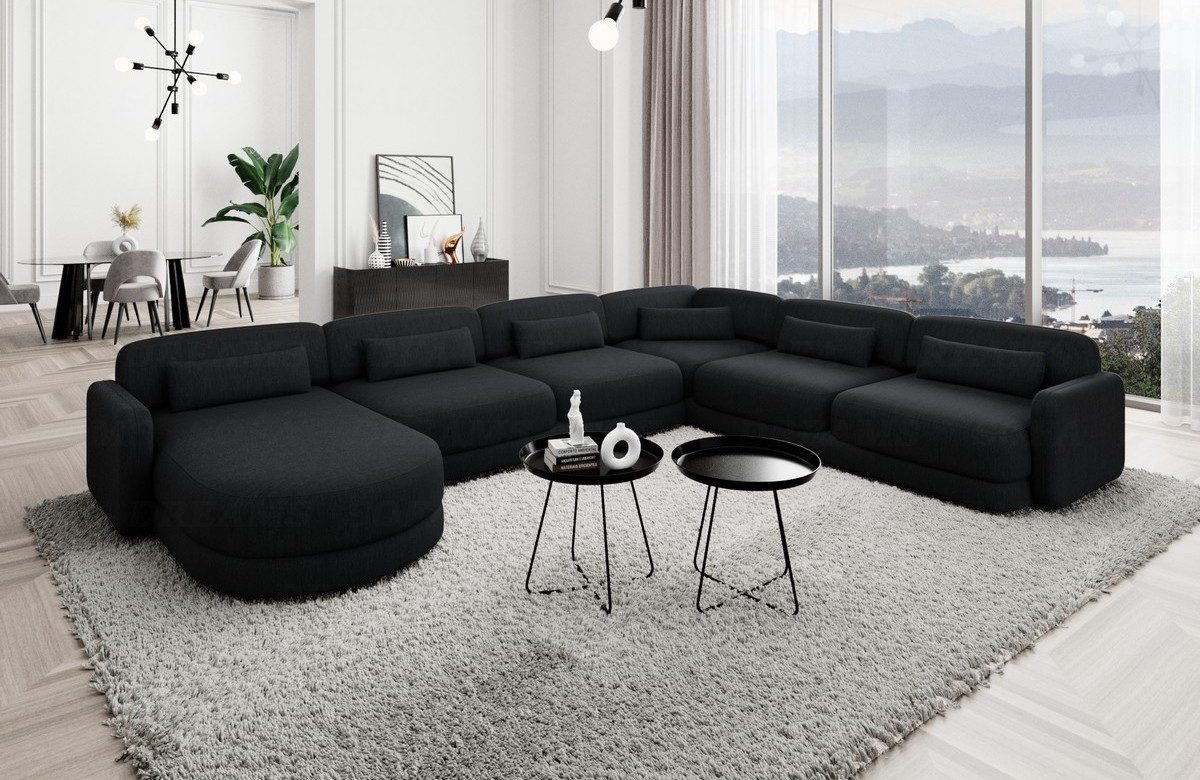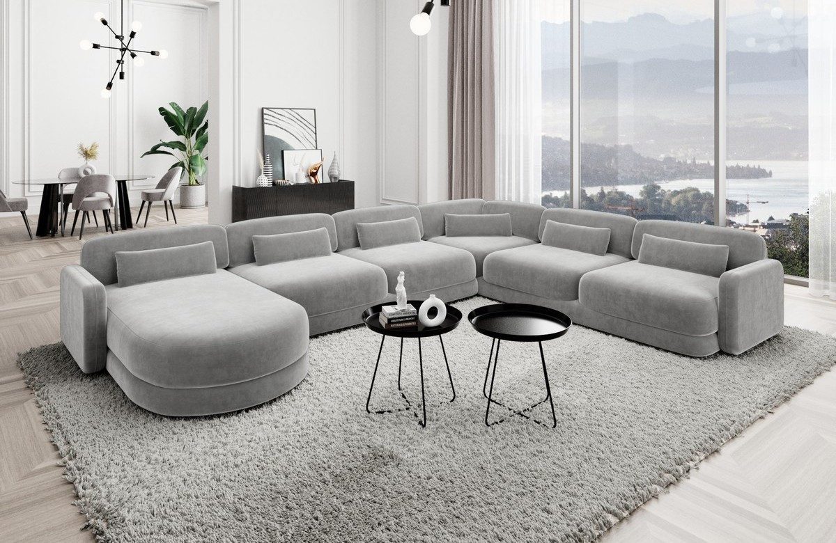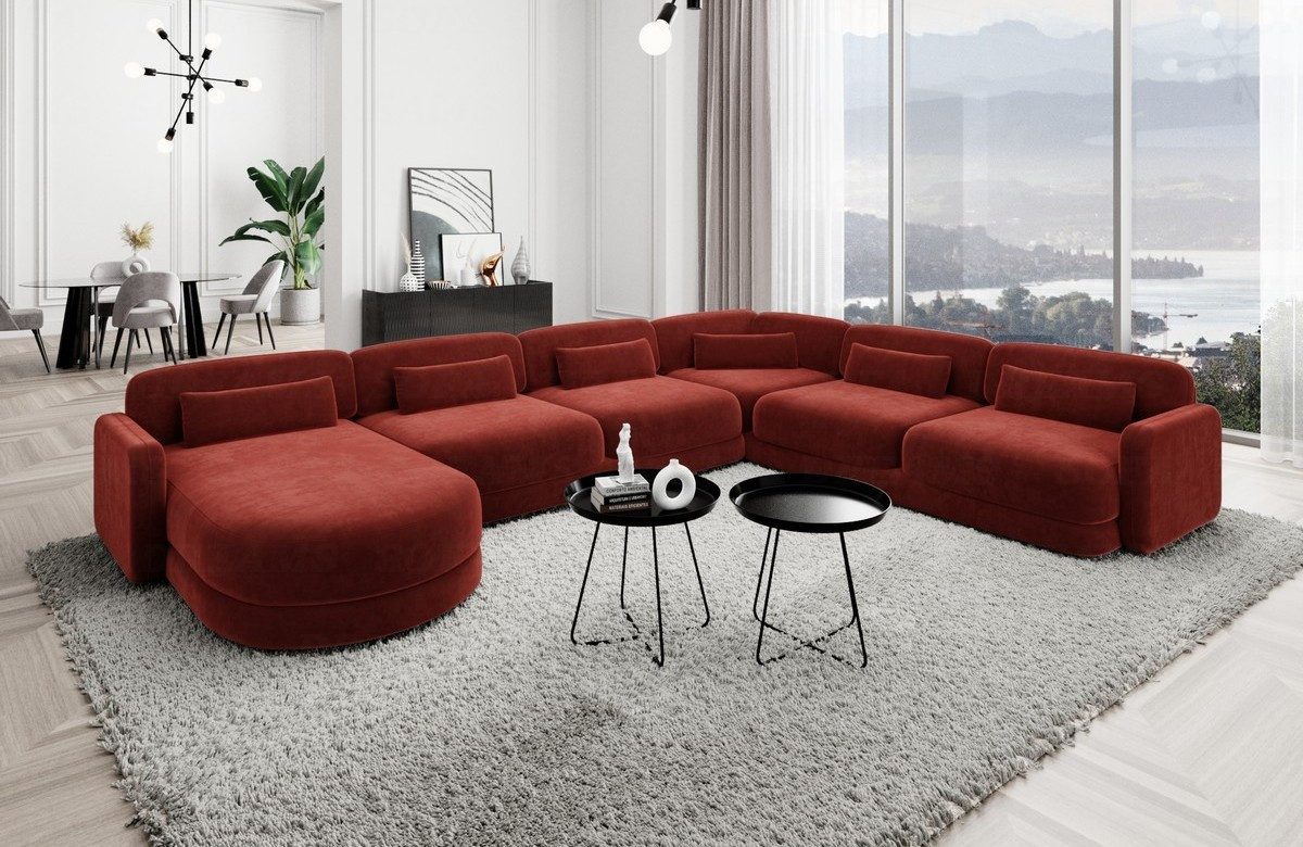 Die Polster Wohnlandschaft Valencia XXL ist in drei verschiedenen Stoffarten erhältlich, um Ihren persönlichen Stil perfekt zu ergänzen. Wählen Sie zwischen dem luxuriösen Samtstoff, dem robusten Strukturstoff oder dem zeitlosen Boucléstoff für ein individuelles Ambiente in Ihrem Zuhause. Dank der stabilen Armlehnen und Rückenlehnen bietet dieses Sofa nicht nur erstklassigen Komfort, sondern auch eine herausragende Langlebigkeit. Die vier einzelnen Sitzplätze, die Ecke und die Ottomane bieten ausreichend Platz für die ganze Familie oder Ihre Gäste, während das luxuriöse und elegante Design eine ansprechende Atmosphäre schafft.
