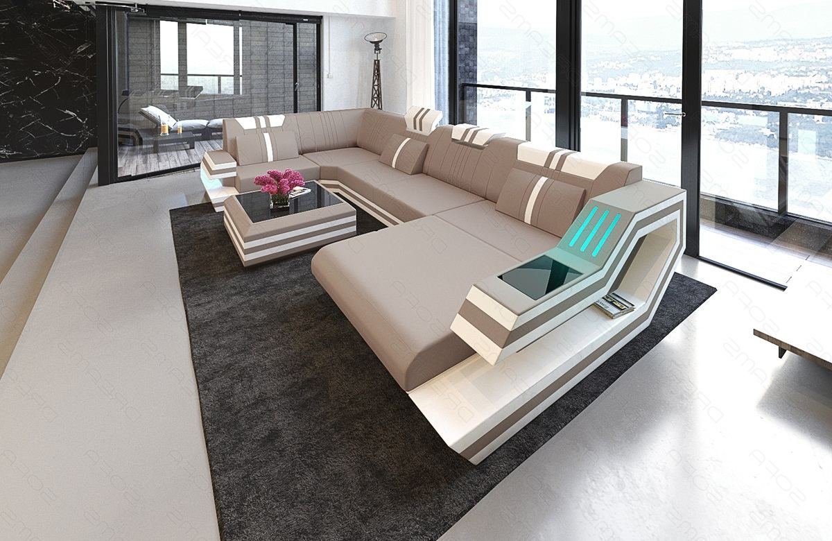 Mit dem Designersofa Ravenna U Form Stoff können Sie abends auf Deckenbeleuchtung oder Stehlampen verzichten. Denn diese Couch bringt Ihr eigenes Licht mit. Die LED-Beleuchtung mit Farbwechsel befindet sich in beiden Armlehnen und lässt sich bequem über eine Touch-Wheel-Fernbedienung steuern. Damit Sie die Möglichkeit haben, auch beim Aufladen elektronischer Geräte bequem sitzen zu bleiben, besitzt die Wohnlandschaft Ravenna einen eigenen USB-Anschluss in der großen Armlehne. Optional erhalten Sie einen passenden Couchtisch und eine Schlaffunktion.