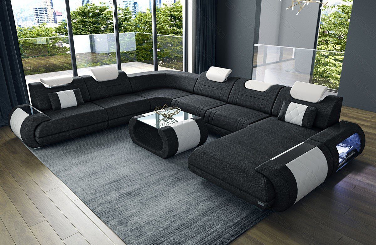 Gemütlich, groß und vor allem modern: Das Strukturstoff Sofa Rimini in XXL ist ein Designersofa für die ganze Familie. Auf diesem Sofa findet jeder seinen Platz. Die breite Ottomane lädt regelrecht zum Entspannen ein und bietet eine großzügige Liegefläche. Das Stoffsofa macht Schluss mit Langeweile im Wohnzimmer und sorgt für frischen Wind in jedem Raum. Dieses elegante Luxussofa bietet einem alles, was man sich nur wünschen kann. Mit seinen massiven, teilweise gesteppten Armlehnen und einer Mischung aus Lederbezügen am Gestell und Stoffbezügen für Sitz- und Liegeflächen können Sie das Sofa Rimini optisch genau nach ihrem Geschmack gestalten. Wählen können Sie zwischen unserem edlen Strukturstoff Hugo und einem besonders pflegeleichtem Mineva Stoff. So genießen Sie eine attraktive Optik und einen hohen Sitzkomfort ganz auf der Höhe der Zeit, die kunstvoll integrierte LED Beleuchtung und die praktischen, verstellbaren Kopfstützen erteilen langweiligem, klassischem Möbeldesign eine klare Absage.