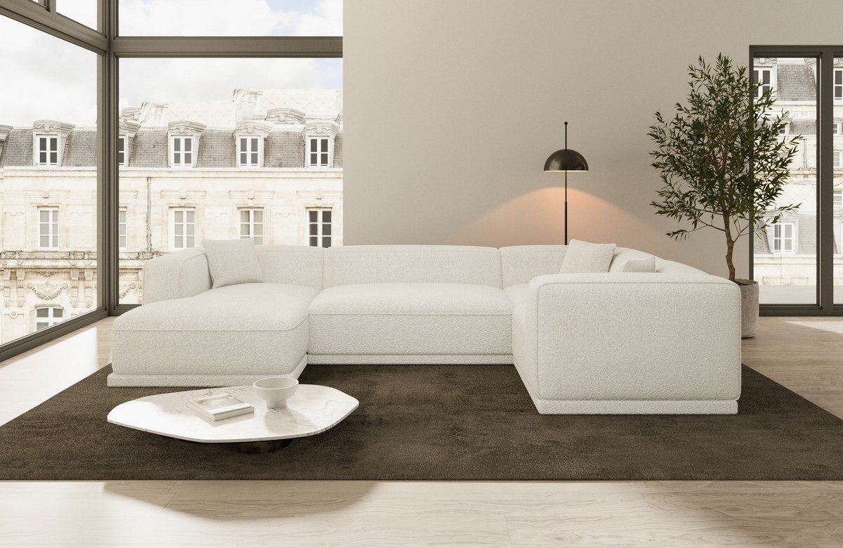 Entdecken Sie den unvergleichlichen Komfort und die zeitlose Eleganz unserer Polster Sofa Wohnlandschaft Merida in der U-Form. Diese exquisite Wohnlandschaft bietet Ihnen nicht nur außergewöhnlichen Komfort, sondern auch maximale Flexibilität mit einer geräumigen Ottomane, deren Ausrichtung nach Ihren Wünschen frei wählbar ist. Die Wohnlandschaft Merida ist in drei erlesenen Stoffarten erhältlich: dem samtig-weichen Samtstoff, dem robust-strukturierten Strukturstoff und dem luxuriös-weichen Boucléstoff. Jedes Material verspricht Ihnen ein erstklassiges Sitzerlebnis und verleiht Ihrem Wohnzimmer einen Hauch von Raffinesse und Stil.