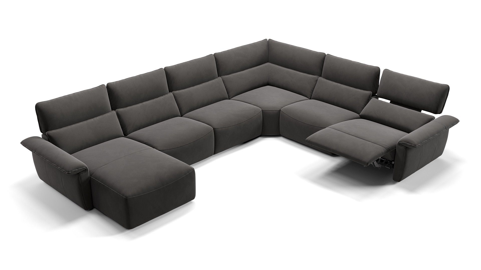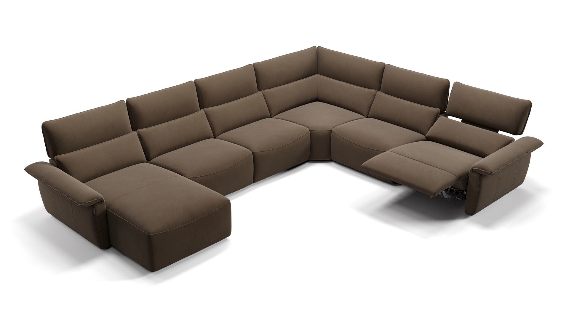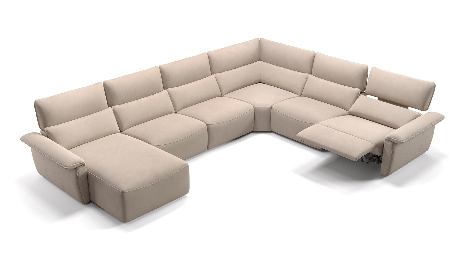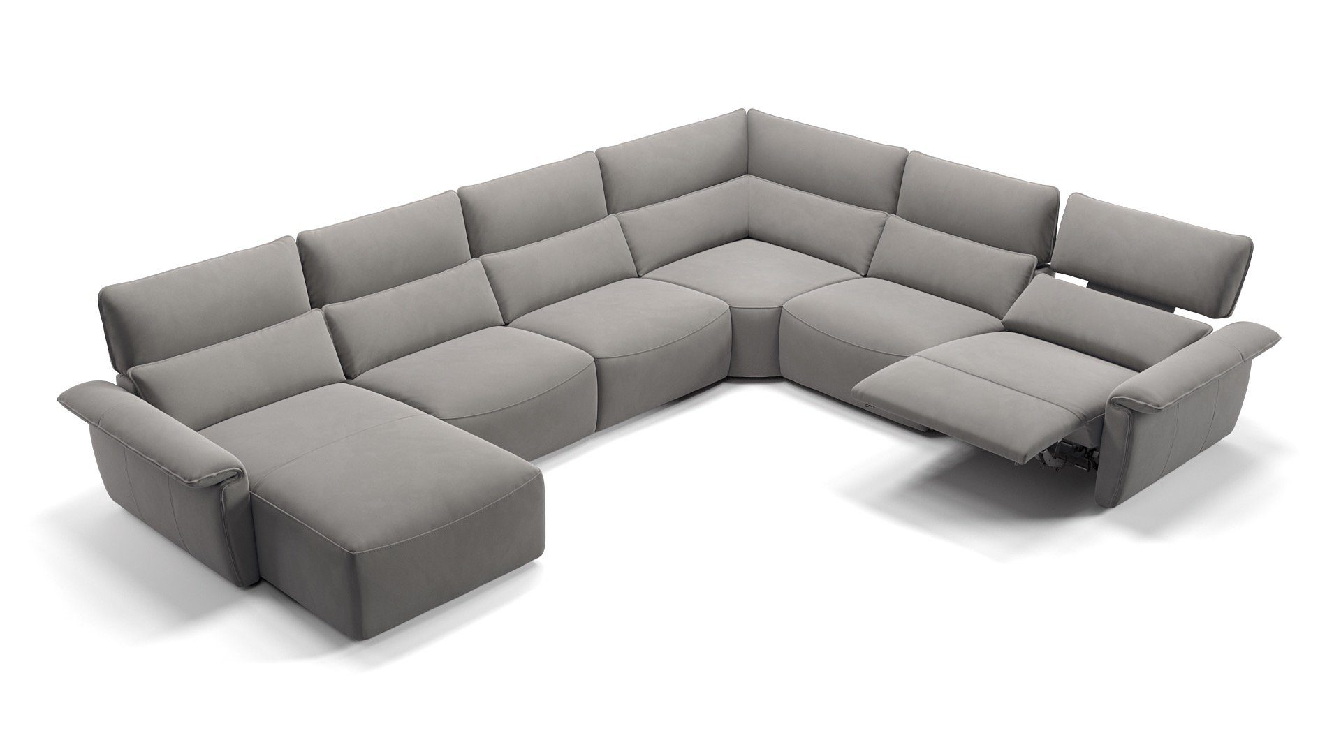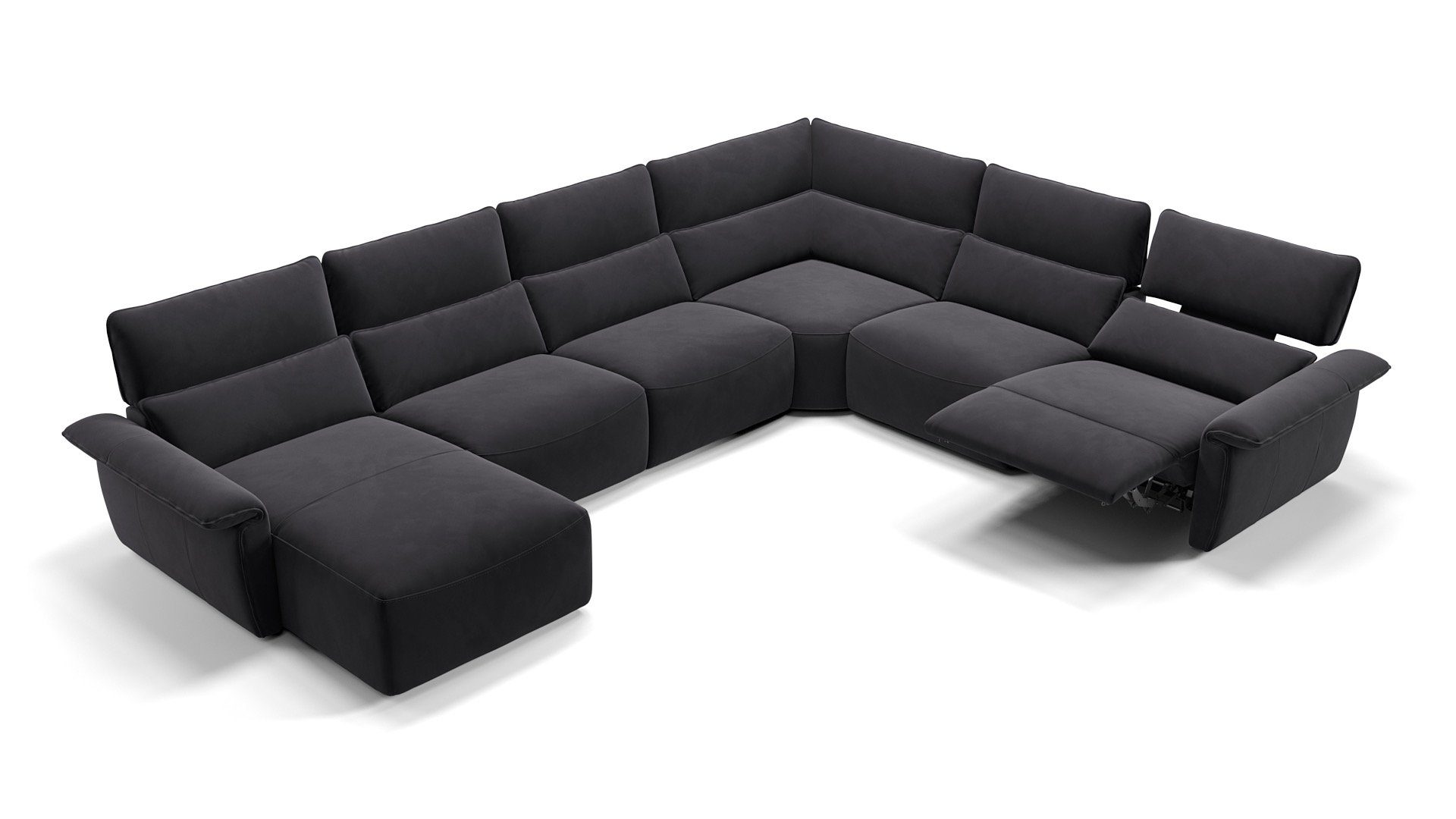 Ausstattung | Elektrische Relaxfunktion am äußeren Sitz Elektrisch höhenverstellbare Kopflehnen an 5 Sitzen Die Kopflehnen sind im Neigungswinkel zusätzlich verstellbar Armlehnen stufenweise verstellbar Italienisches Design Sofa wandfrei stellbar |