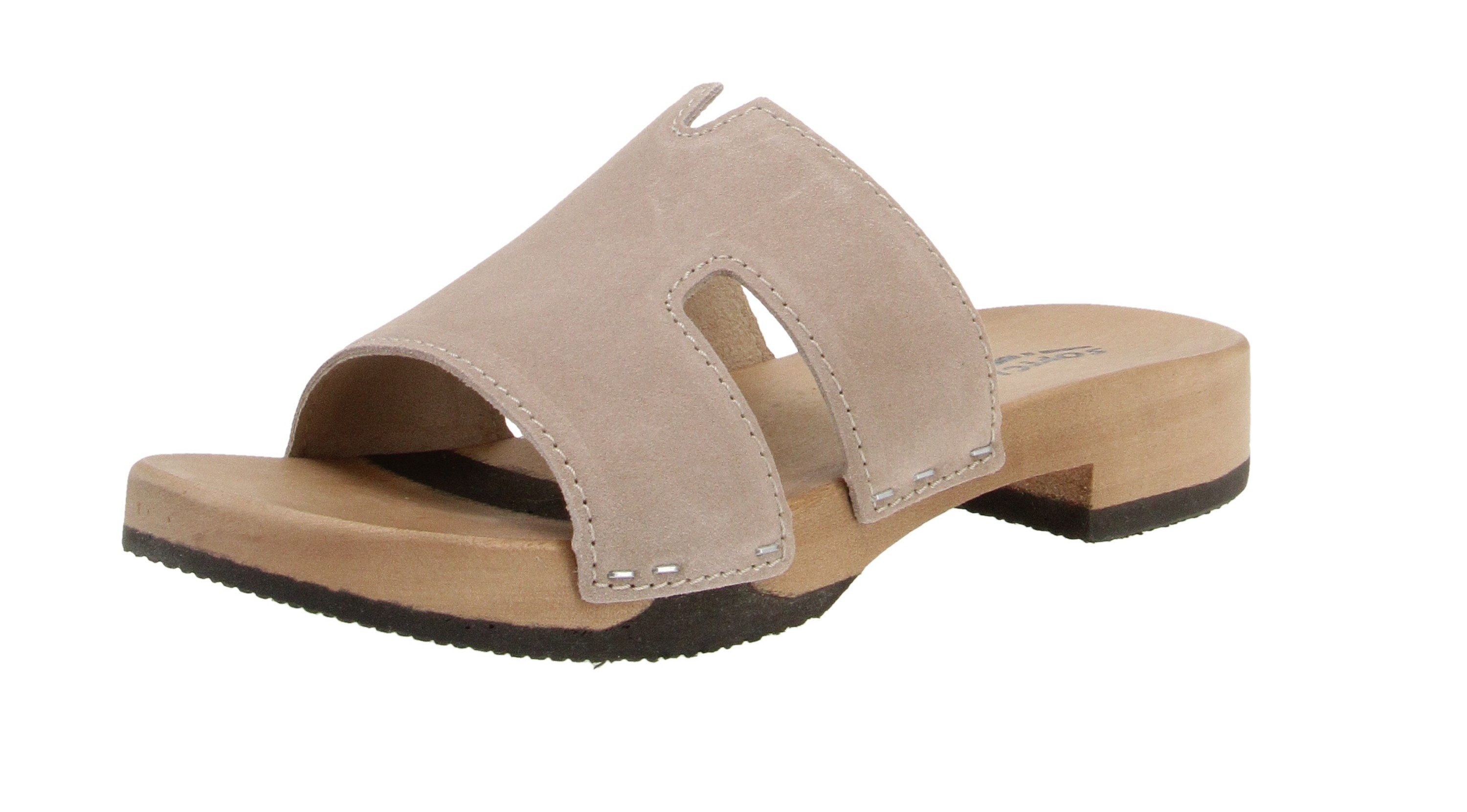 Gegensätze ziehen sich an! Das Zusammenspiel aus Holzsohle mit unterstelltem Blockabsatz und weichem Veloursleder ergibt die perfekte Pantolette. Raffinierte Details wie die Verbindung beider Riemen miteinander in der Mitte, der Schlitz am Vorderschuh und die dezente Metallschließe runden den angesagten Look dieser Pantolette von Softclox perfekt ab.