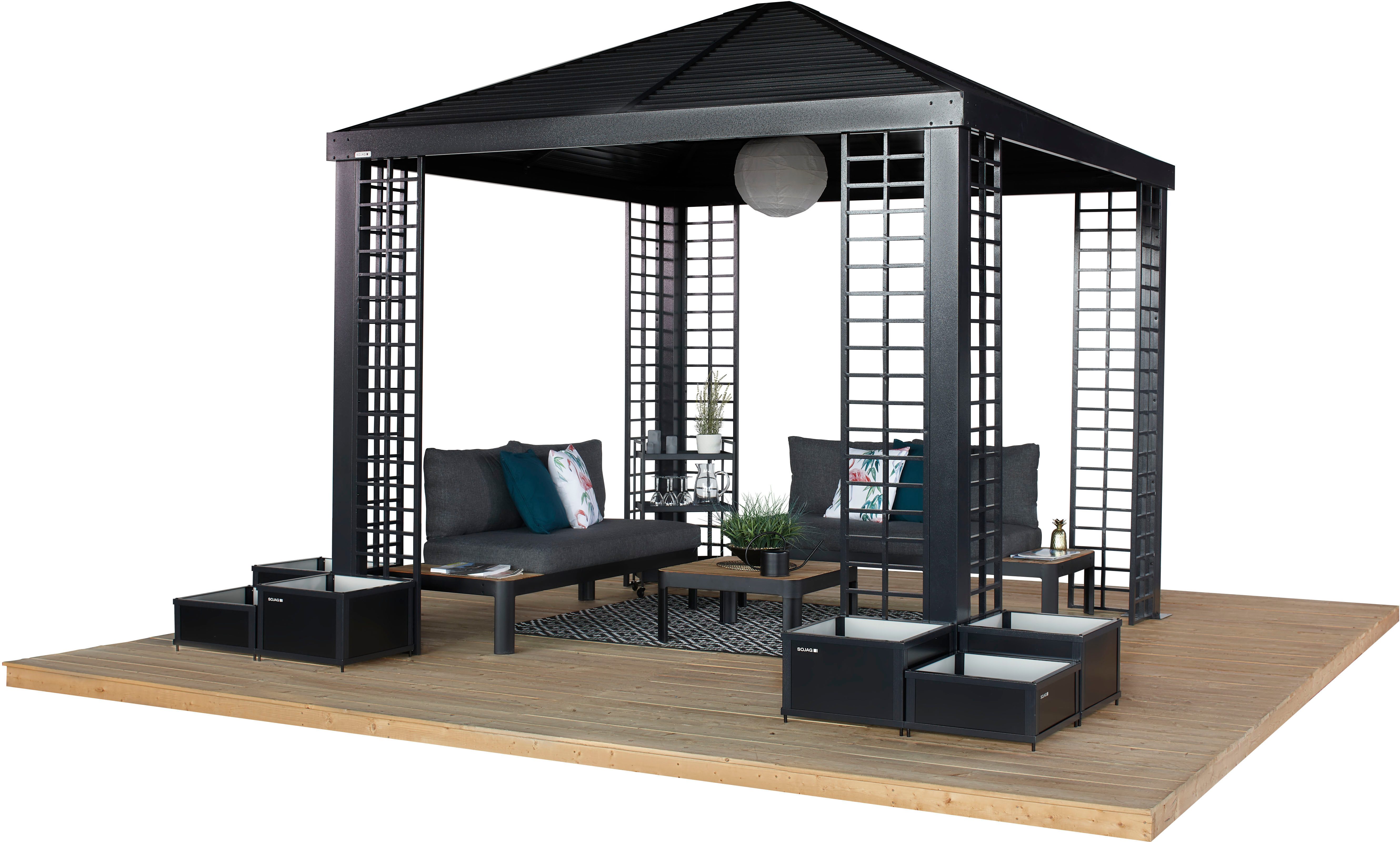 Sojag Aluminium Pavillon Havana 1010, Inkl. 6 Pflanzkübeln, Schwarz, 298x298x294 cm Modern, hochwertig, wetterfest - der Pavillon Havana von Sojag ist aus rostbeständigem Aluminium gefertigt und punktet mit auffallendem Design sowie 6 Pflanzkübeln! Ob zum Grillen mit Freunden, als schattiges Plätzchen zum Lesen oder zum gemütlichen Zusammensitzen mit der Familie — der Pavillon Havana von Sojag ist das optische Highlight deines Gartens und gleichzeitig dein gemütlicher Rückzugsort. Das Gestell des Pavillons ist aus rostbeständigem Aluminium gefertigt und punktet mit einem wasserdichten Stahldach. Die Gitterelemente an den Pfosten tragen zur außergewöhnlichen Optik des Pavillons bei und dienen zusätzlich als Vorrichtung für individuelle Dekoration. Ein weiterer Pluspunkt von Havanna ist das Zubehör, denn im Lieferumfang sind 6 auf das Design des Pavillons abgestimmte Pflanzkübel enthalten. Sonnen- und Wetterschutz in ästhetischer Perfektion — Havana von Sojag erweitert deine Möglichkeiten im Freien. Mehr Zeit im Garten, mehr Qualitätszeit! Konstruktion: Pulverbeschichtetes Aluminium, Ø 1,1 mm Interpon Pulverbeschichtung von AkzoNobel 4 massive Pfosten mit dekorativem Gitter Rostbeständig und wetterfest Dach: Eindeckung aus verzinktem Stahlblech, 0,4 mm 100 % UV-Schutz, wasserabweisend Wetterbeständig und wartungsarm Features: Montagefertiger Bausatz Inkl. 6 isolierter Pflanzkübel Integrierter Wasserablass statt klassischer Regenrinnen