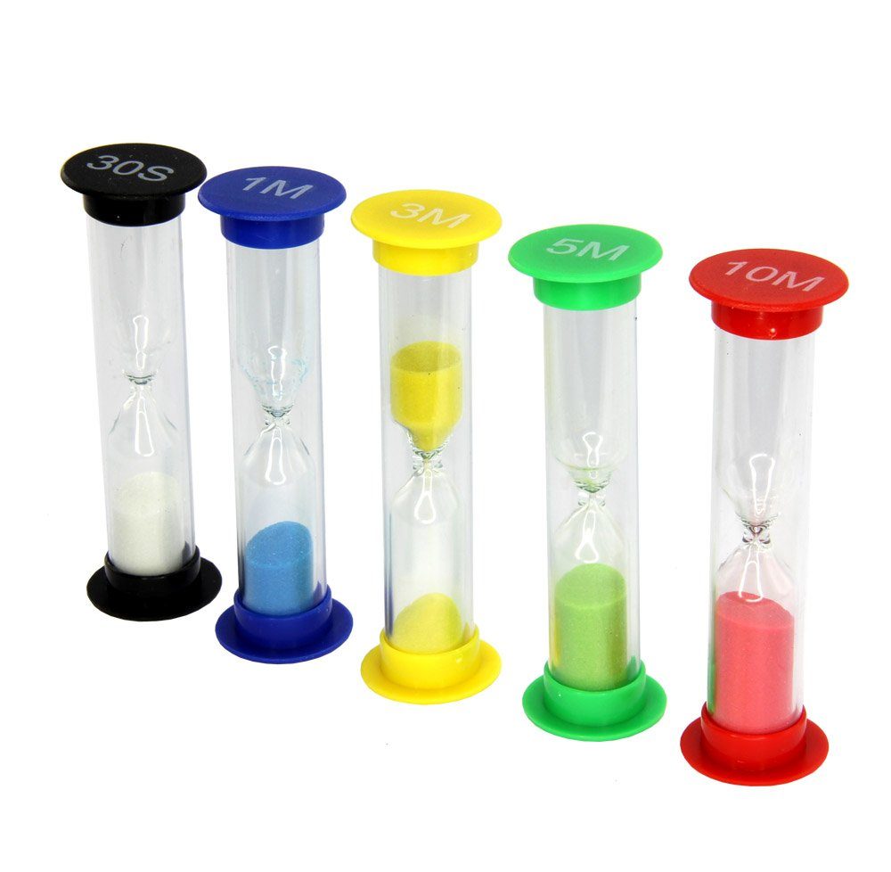 5 Kunststoff-Sanduhren mit unterschiedlichen Sandfarben und Zeiten.
