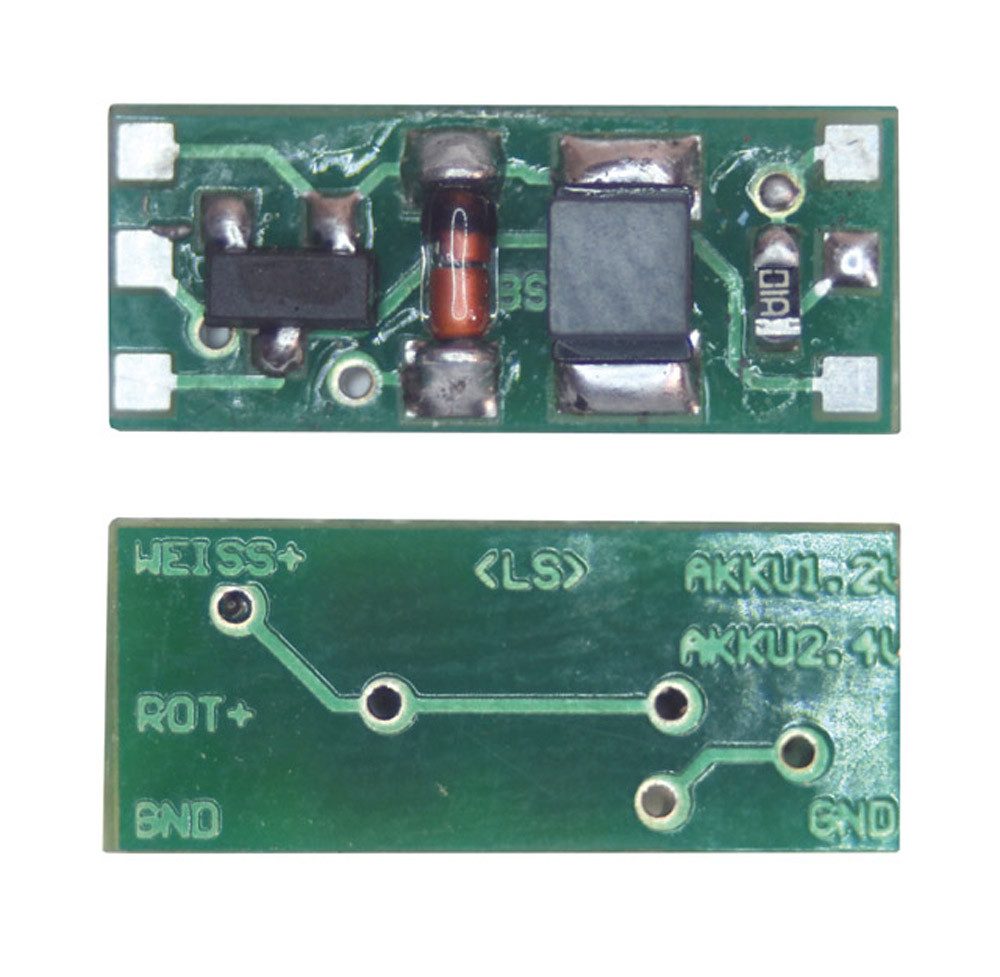 Um bei drahtgeführten Fahrzeugen trotz nur zweier NiMh Akkus auch weiße LED betreiben zu können, ist diese kleine Schaltung sinnvoll.