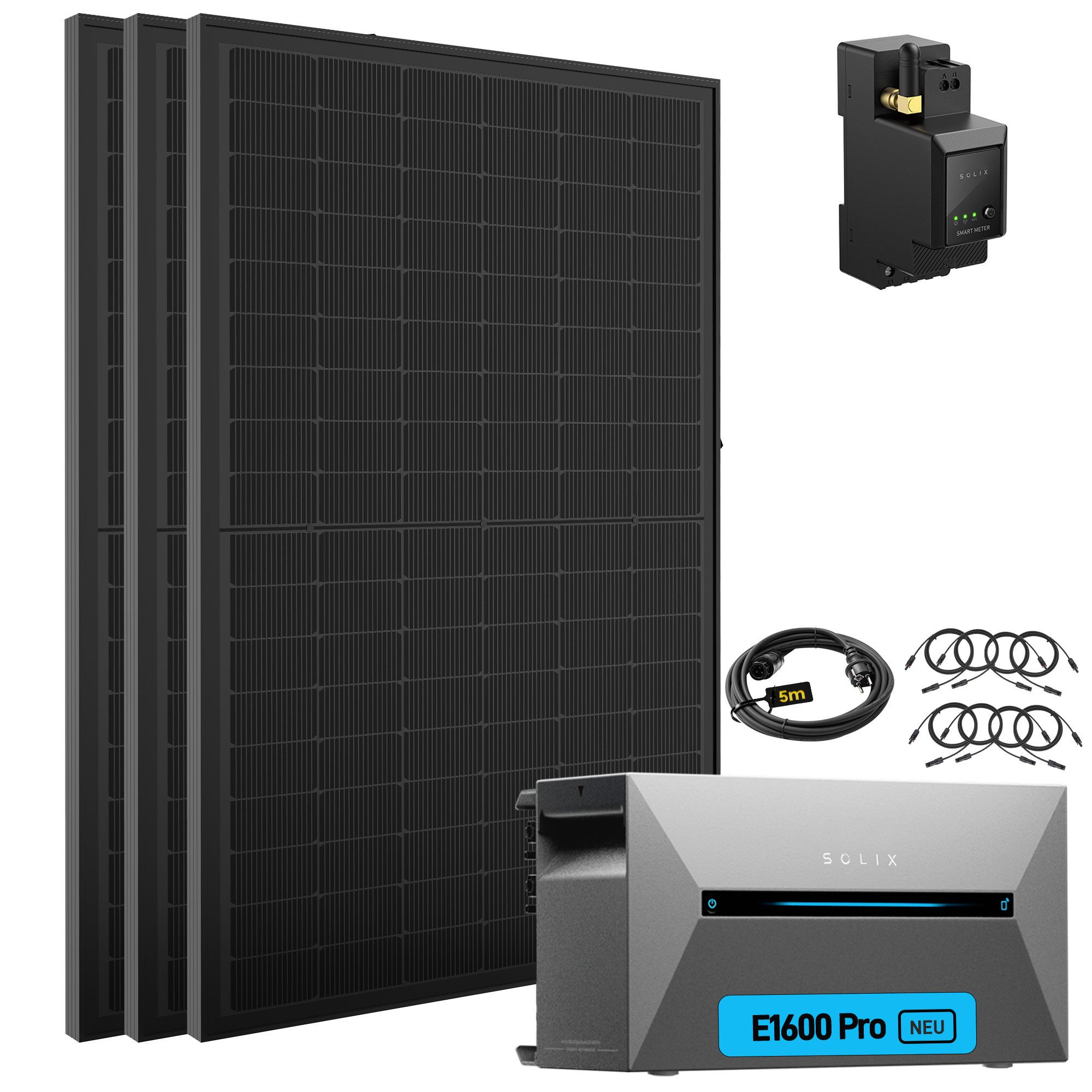 Das Balkonkraftwerk besteht aus hochwertigen Komponenten: 3 Solarmodule mit jeweils 450 W, 1 x SOLIX Solarbank 2 E1600 Pro, ein 5m Verbindungskabel, 8x 3,0m DC-Verlangerungskabel und 1 x Smart Meter.